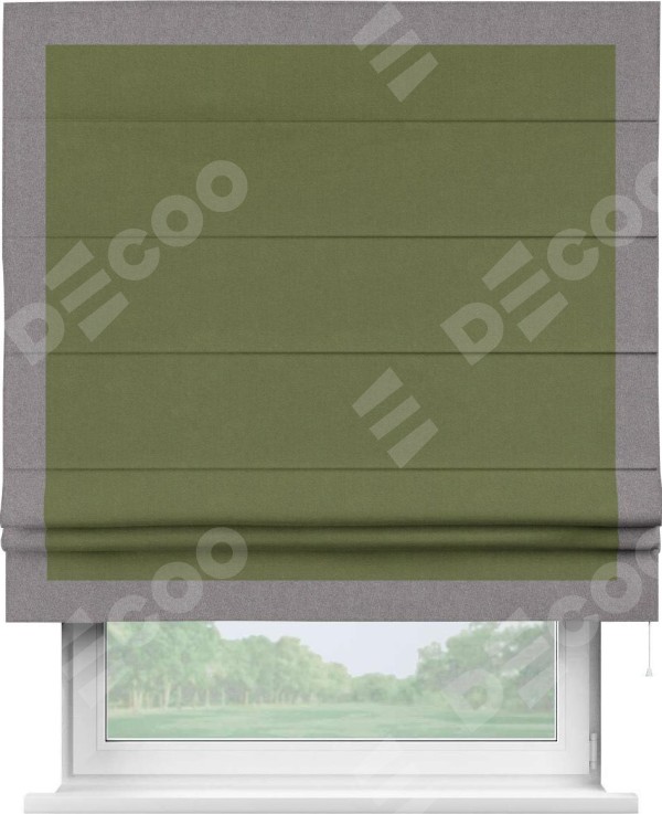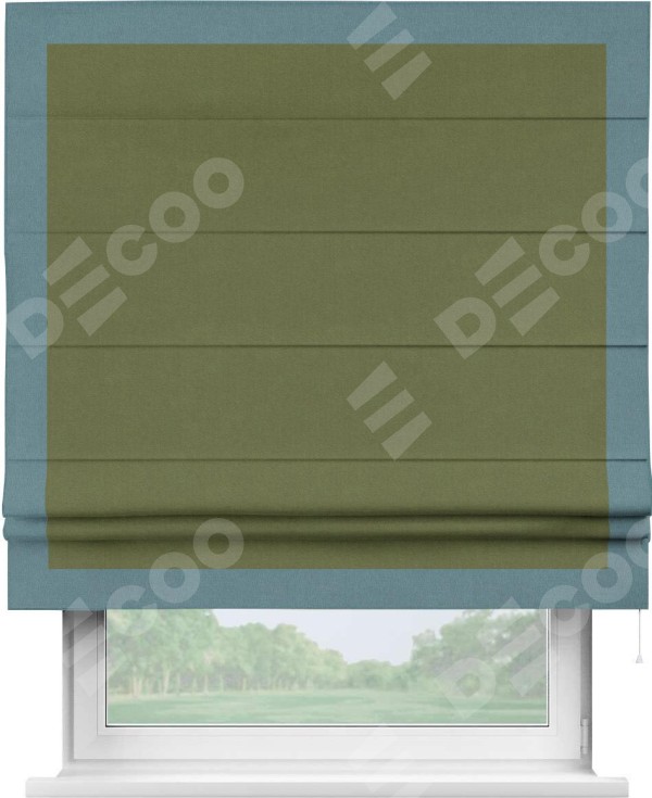 Римская штора «Кортин» с кантом Чесс, для проема, лён блэкаут оливковый