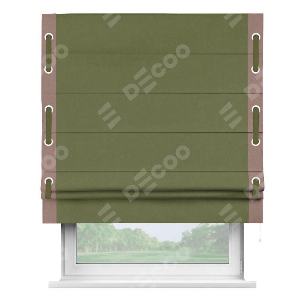 Римская штора производителя «Cortin», используется для проёма, пошита из ткани лён блэкаут оливковый, артикул 69516. Отделка шторы кантом «Стрим Дуо» на кантах расположены люверсы с пояском, ткань для канта используется из льна разной расцветки на выбор. Ткань для пояска обычно используется из основной ткани шторы, а так же можно сделать из любой расцветки по желанию. Имеет универсальный механизм и подходит для монтажа: на потолок, на стену и в нишу.