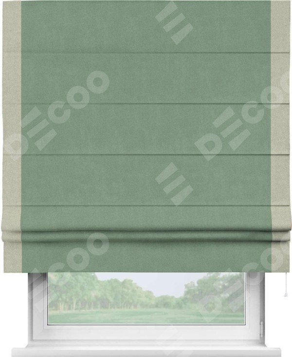 Римская штора производителя «Cortin», используется для проёма, пошита из ткани лён блэкаут светло-бирюзовый, артикул 69443. Отделка шторы кантом «Стрим Дуо», ткань для канта используется из льна разной расцветки на выбор. Имеет универсальный механизм и подходит для монтажа: на потолок, на стену и в нишу.