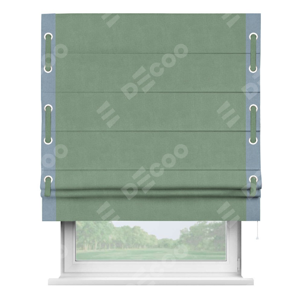 Римская штора производителя «Cortin», используется для проёма, пошита из ткани лён блэкаут светло-бирюзовый, артикул 69443. Отделка шторы кантом «Стрим Дуо» на кантах расположены люверсы с пояском, ткань для канта используется из льна разной расцветки на выбор. Ткань для пояска обычно используется из основной ткани шторы, а так же можно сделать из любой расцветки по желанию. Имеет универсальный механизм и подходит для монтажа: на потолок, на стену и в нишу.
