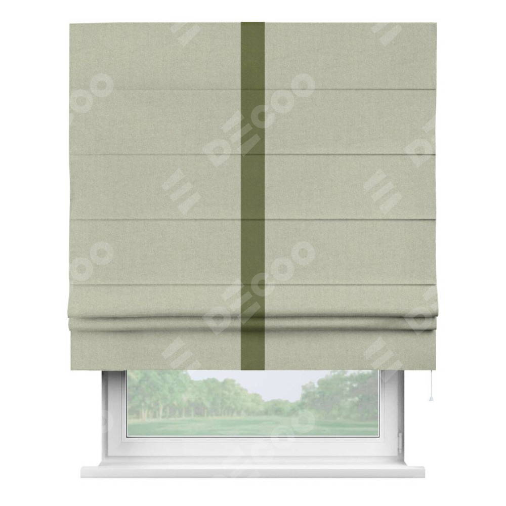 Римская штора производителя «Cortin», используется для проёма, пошита из ткани лён блэкаут серо-бежевый, артикул 69450. Отделка шторы кантом «Хайвэй», ткань для канта используется из льна разной расцветки на выбор. Имеет универсальный механизм и подходит для монтажа: на потолок, на стену и в нишу.