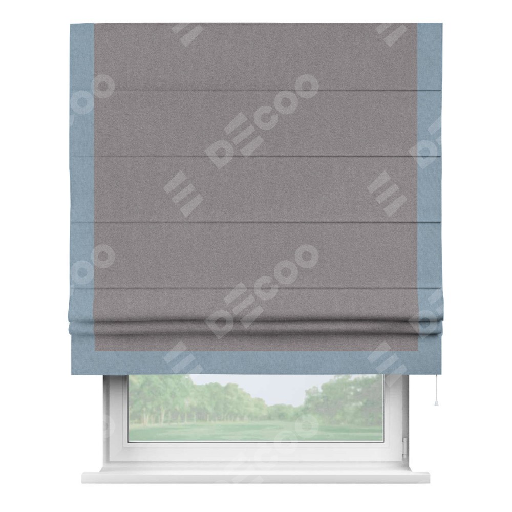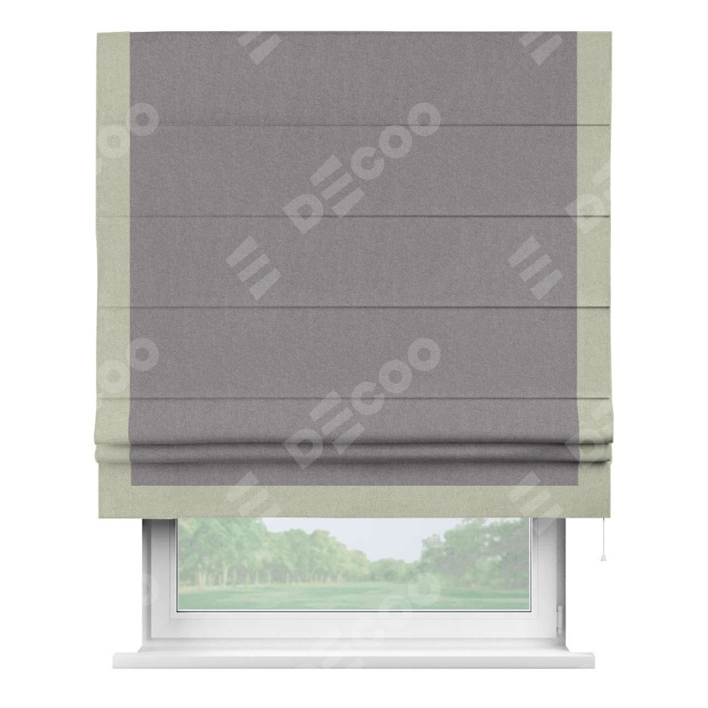 Римская штора производителя «Cortin», используется для проёма, пошита из ткани лён блэкаут сиреневый, артикул 69576. Отделка шторы кантом «Виктория», ткань для канта используется из льна разной расцветки на выбор. Имеет универсальный механизм и подходит для монтажа: на потолок, на стену и в нишу.