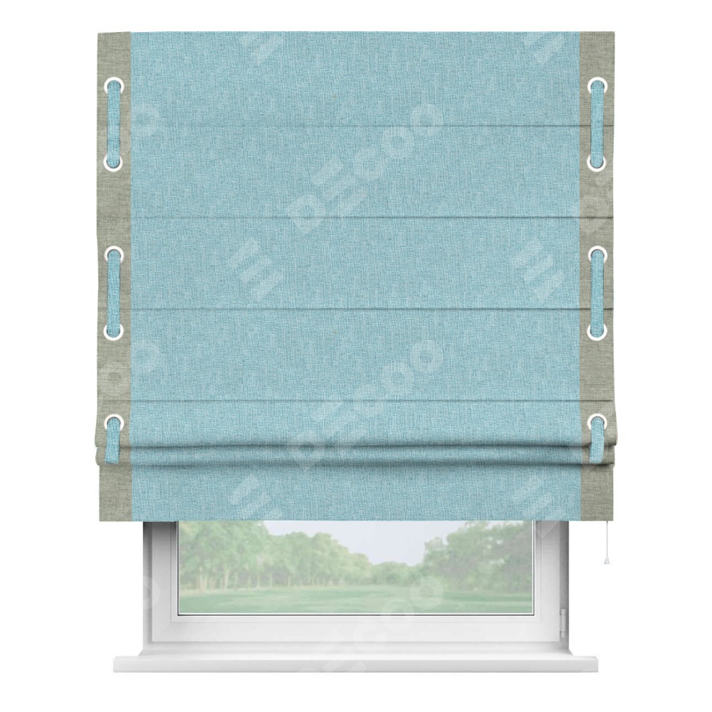 Римская штора производителя «Cortin», используется для проёма, пошита из ткани лён кашемир голубой, артикул 21616. Отделка шторы кантом «Стрим Дуо» на кантах расположены люверсы с пояском, ткань для канта используется из льна разной расцветки на выбор. Ткань для пояска обычно используется из основной ткани шторы, а так же можно сделать из любой расцветки по желанию. Имеет универсальный механизм и подходит для монтажа: на потолок, на стену и в нишу.