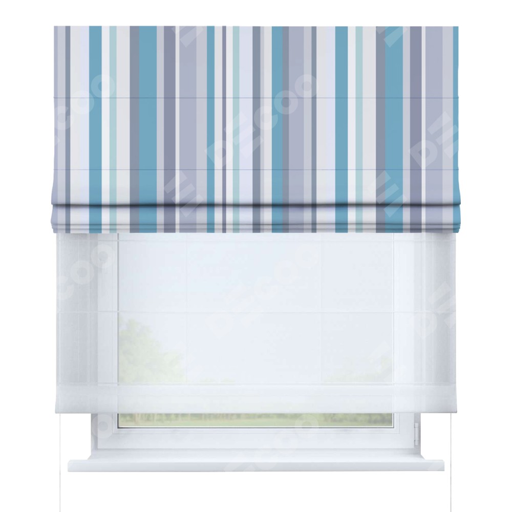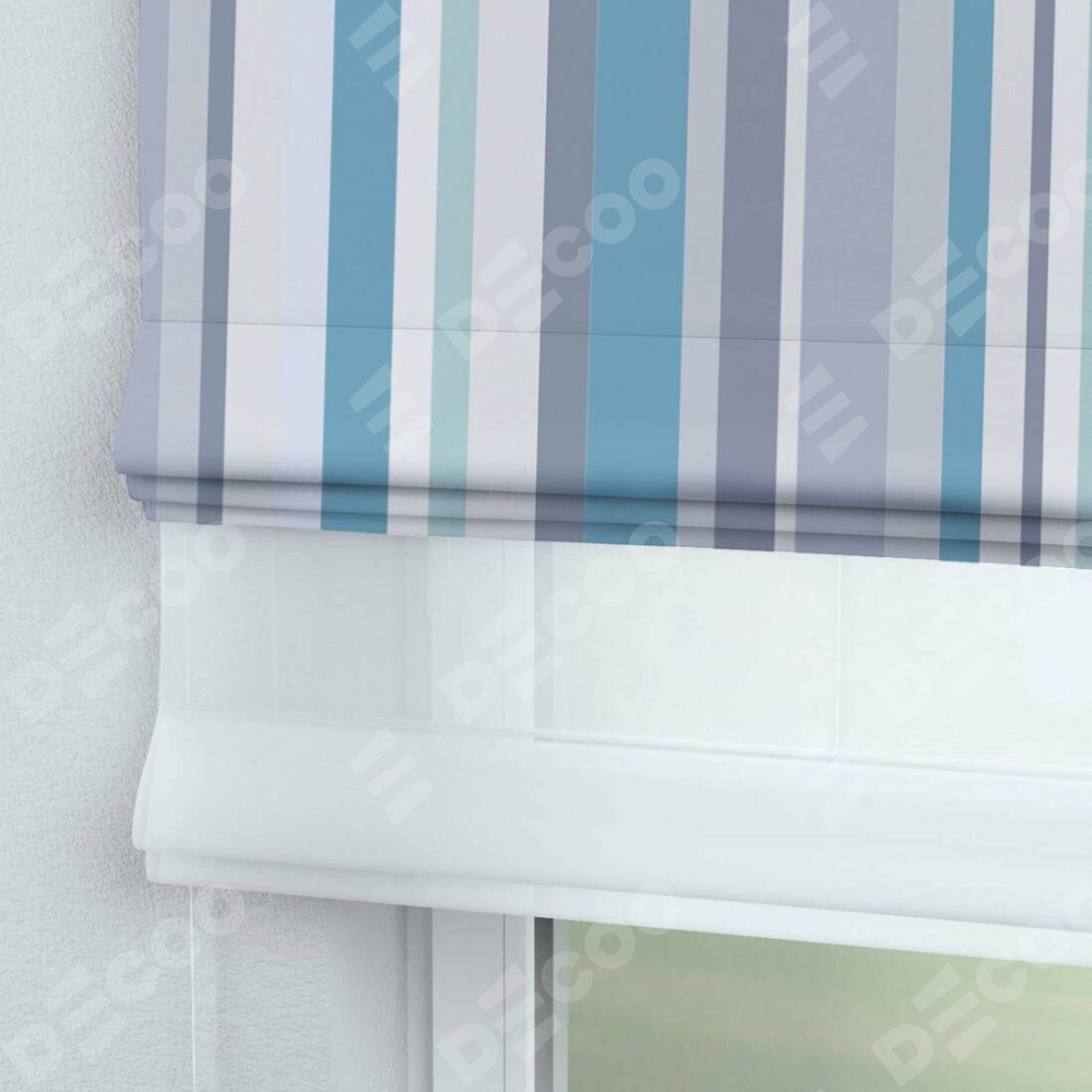 Римская штора день-ночь производителя «Cortin», используется для проёма, пошита из двух полотен, с лицевой блэкаут с нанесением сублимационной печати «Морские линии», вторая ткань тюль (по стандарту комплектуется тюль белого цвета артикул V-01). Имеет универсальный механизм и подходит для монтажа: на потолок, на стену и в нишу.