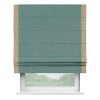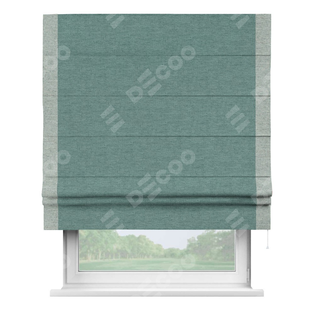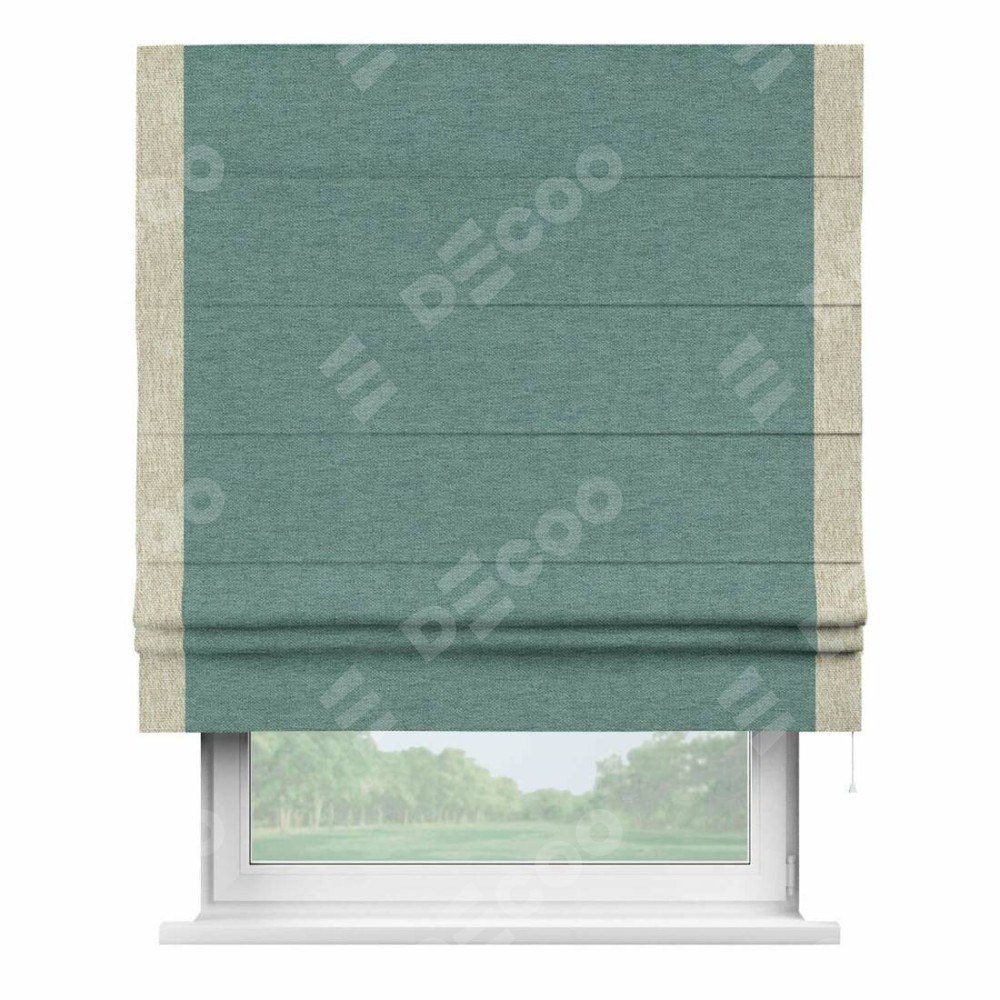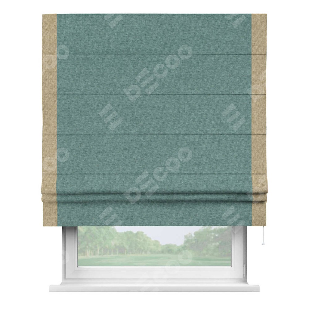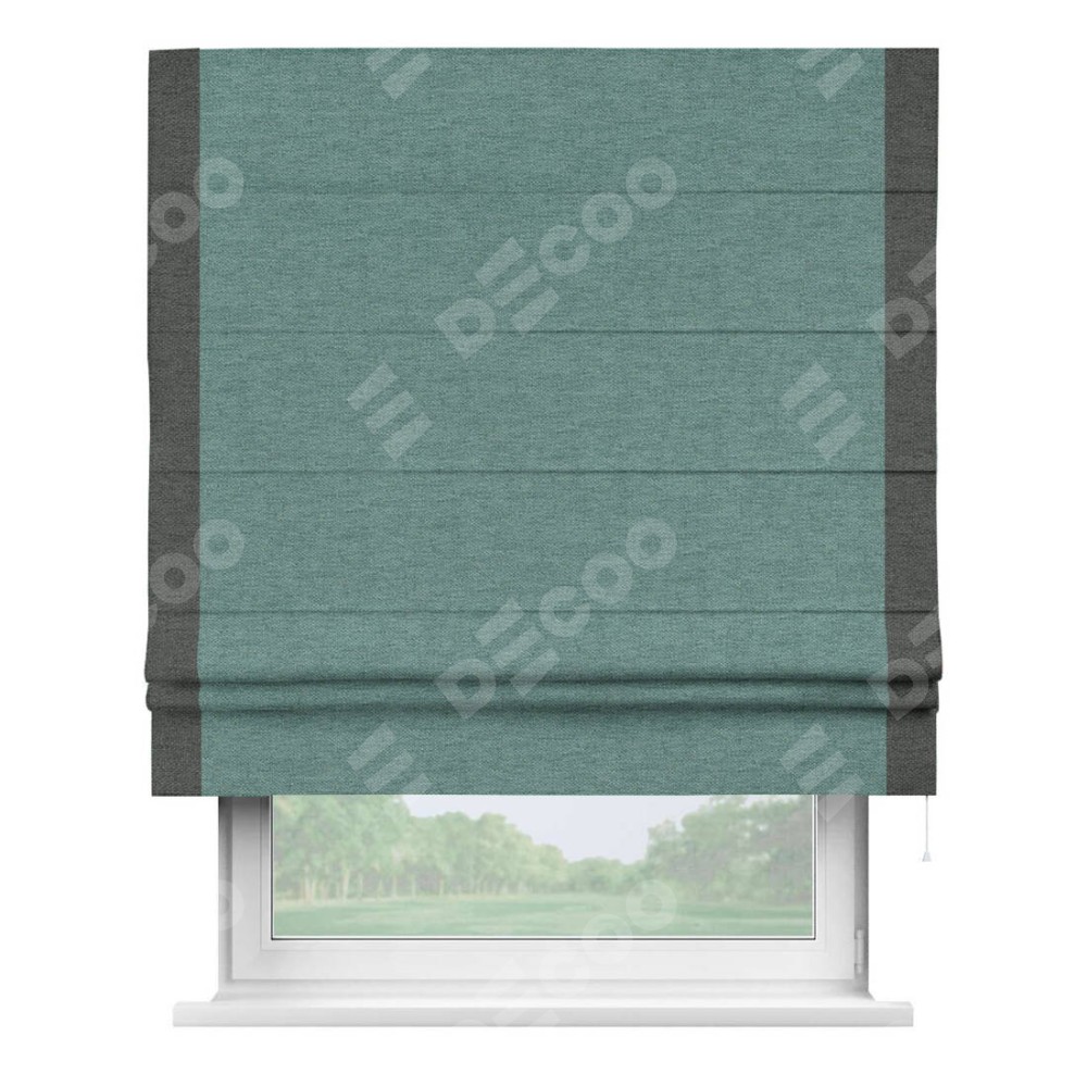 Римская штора производителя «Cortin», используется для проёма, пошита из ткани стиф димаут бирюзовый, артикул 18196. Отделка шторы кантом «Стрим Дуо», ткань для канта используется из стифа разной расцветки на выбор. Имеет универсальный механизм и подходит для монтажа: на потолок, на стену и в нишу.