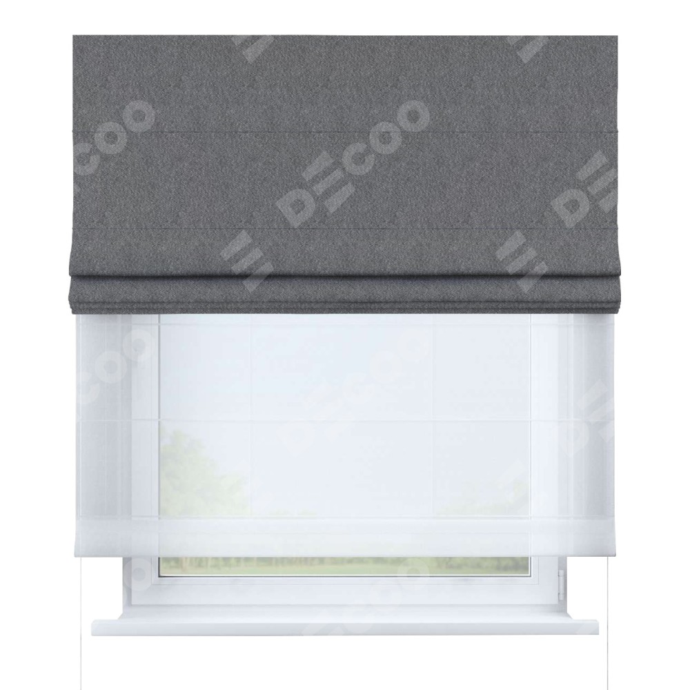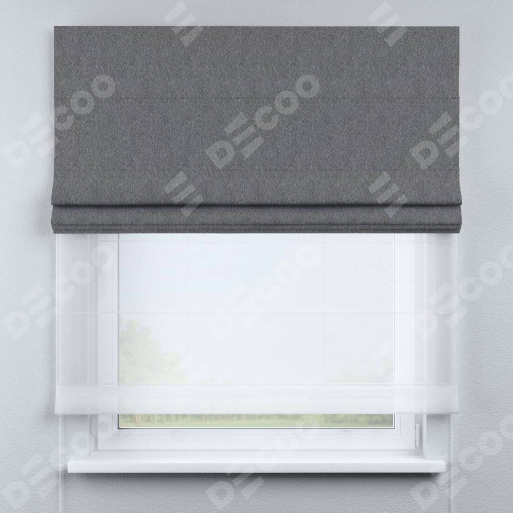 Римская штора день-ночь производителя «Cortin», используется для проёма, пошита из двух полотен, с лицевой стороны софт однотонный серый артикул 70605, вторая ткань тюль (по стандарту комплектуется тюль белого цвета артикул V-01). Имеет универсальный механизм и подходит для монтажа: на потолок, на стену и в нишу.