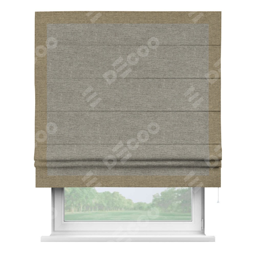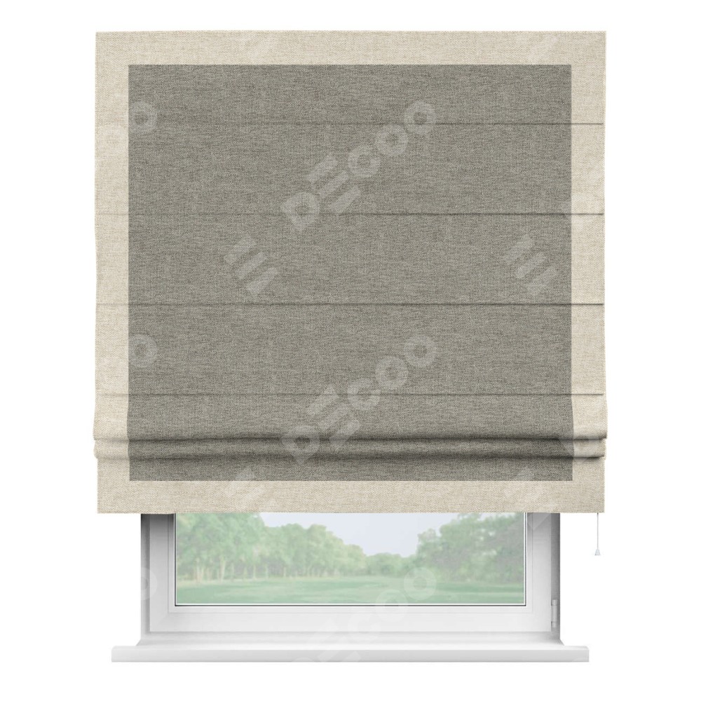 Римская штора производителя «Cortin», используется для проёма, пошита из ткани стиф димаут серо-коричневый, артикул 44028. Отделка шторы кантом «Чесс», ткань для канта используется из стифа разной расцветки на выбор. Имеет универсальный механизм и подходит для монтажа: на потолок, на стену и в нишу.