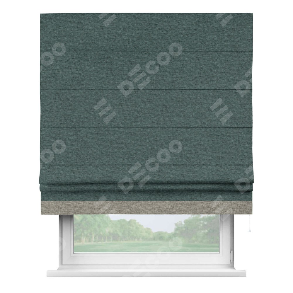 Римская штора производителя «Cortin», используется для проёма, пошита из ткани стиф димаут сине-зелёный, артикул 18194. Отделка шторы кантом «Джестер», ткань для канта используется из стифа разной расцветки на выбор. Имеет универсальный механизм и подходит для монтажа: на потолок, на стену и в нишу.