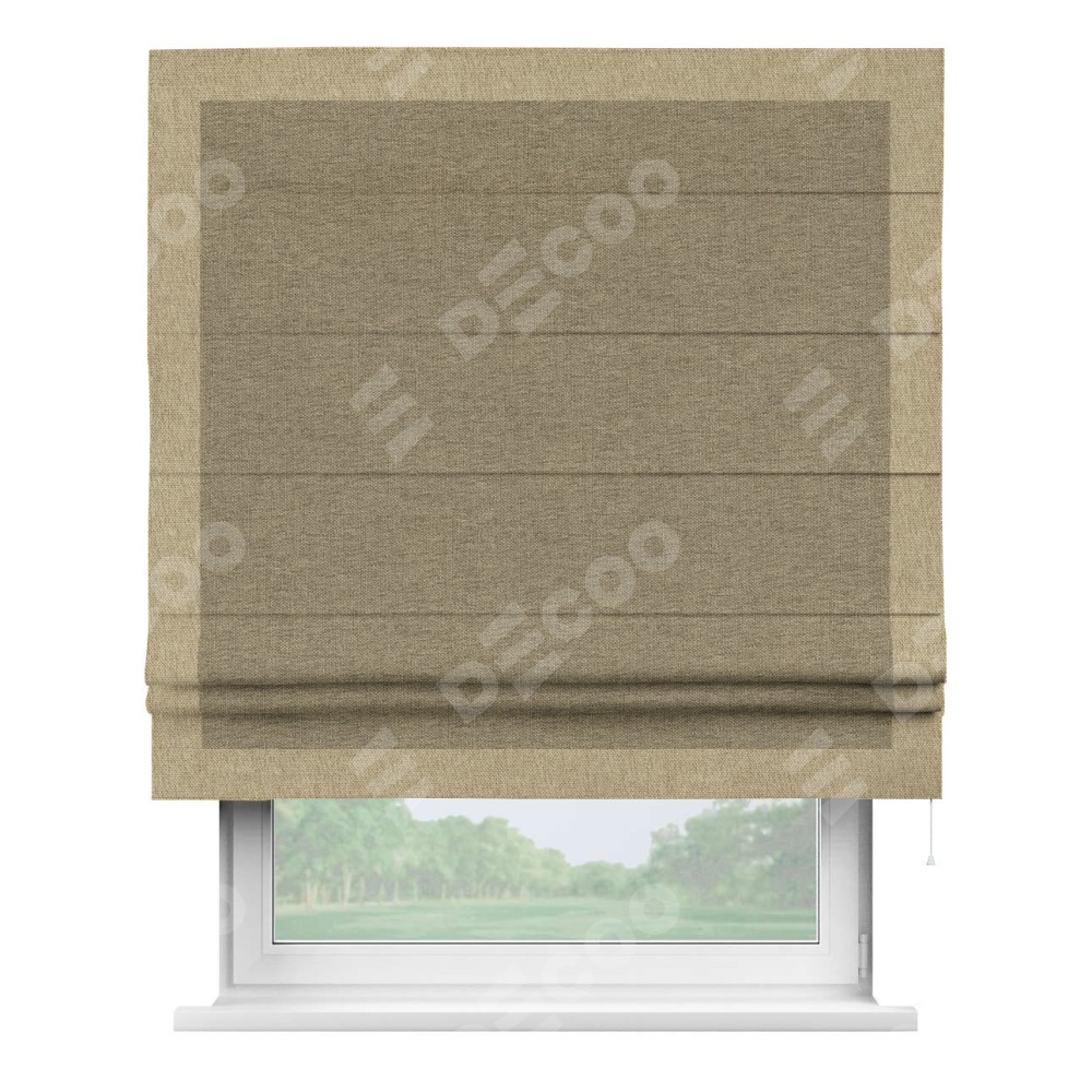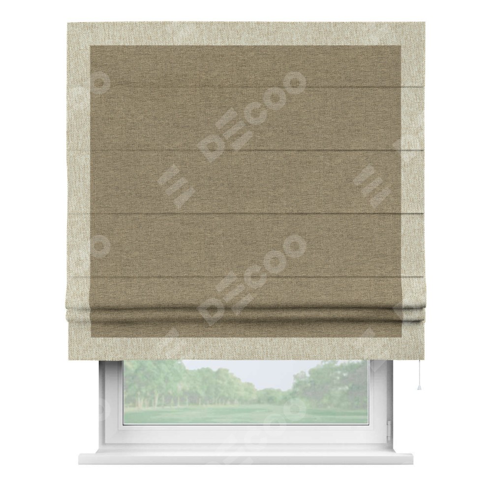Римская штора производителя «Cortin», используется для проёма, пошита из ткани стиф димаут тёмно-бежевый, артикул 18085. Отделка шторы кантом «Чесс», ткань для канта используется из стифа разной расцветки на выбор. Имеет универсальный механизм и подходит для монтажа: на потолок, на стену и в нишу.
