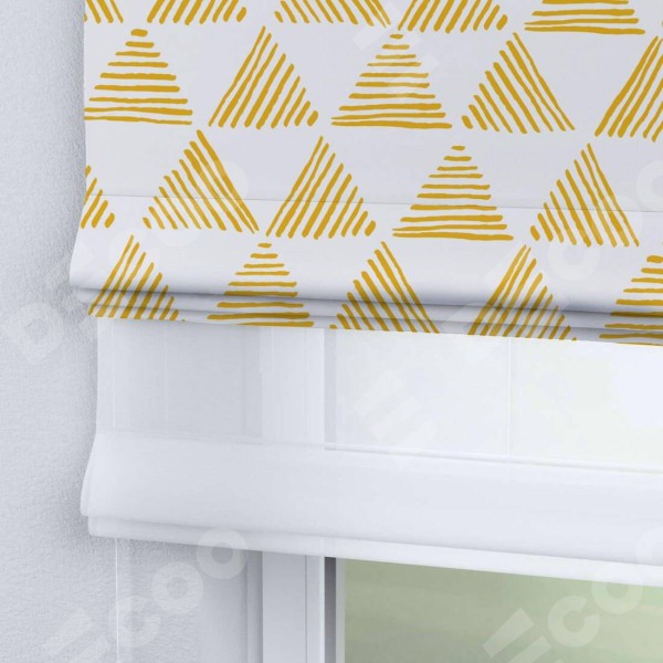 Римская штора день-ночь производителя «Cortin», используется для проёма, пошита из двух полотен, с лицевой блэкаут с нанесением сублимационной печати «Желтые треугольники», вторая ткань тюль (по стандарту комплектуется тюль белого цвета артикул V-01). Имеет универсальный механизм и подходит для монтажа: на потолок, на стену и в нишу.