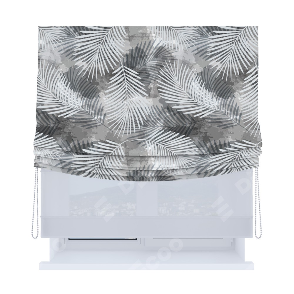 Римская штора день-ночь производителя «Cortin», используется для проёма, пошита из двух полотен, с лицевой блэкаут с нанесением сублимационной печати «Листья в тени», вторая ткань тюль (по стандарту комплектуется тюль белого цвета артикул V-01). Имеет универсальный механизм и подходит для монтажа: на потолок, на стену и в нишу. Удобное управление каждой шторой отдельно.
