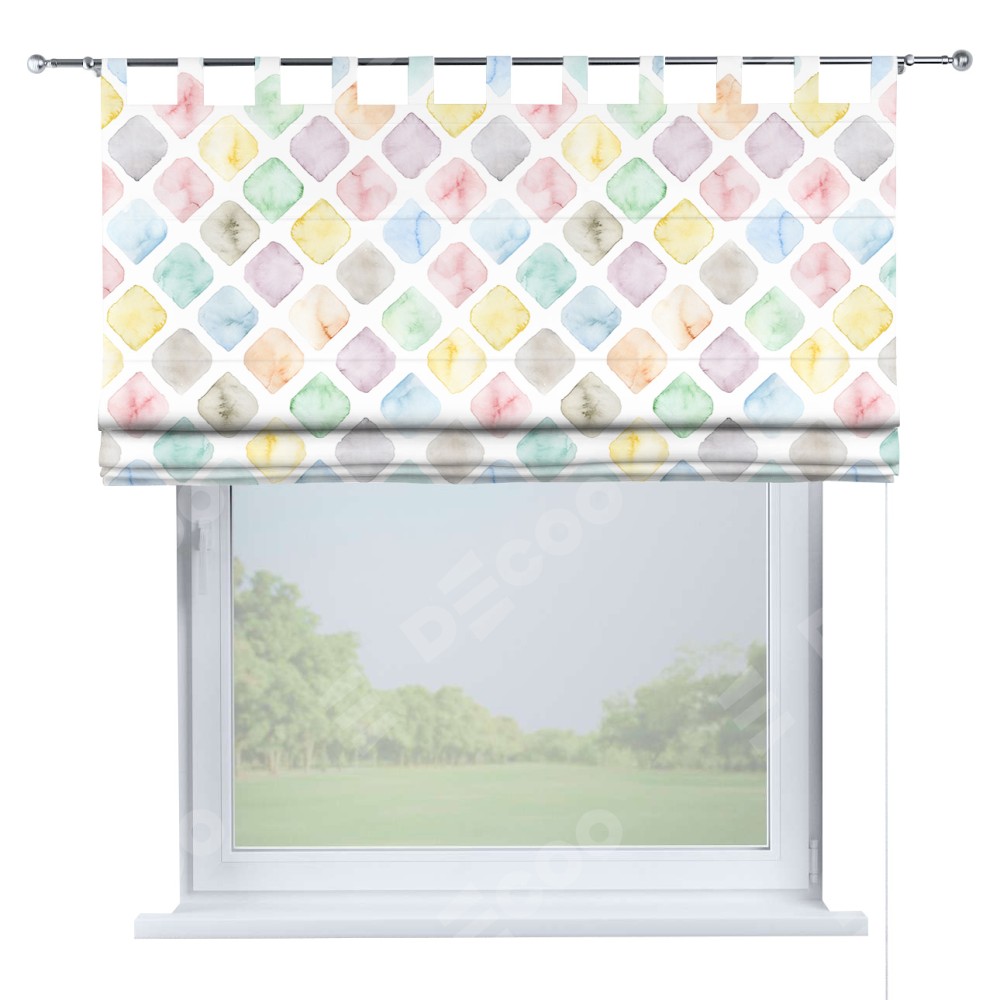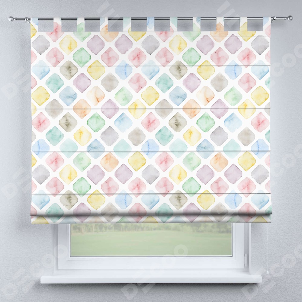 Римская штора производителя «Cortin», используется для проёма, пошита из ткани блэкаут с нанесением сублимационной печати «Мозаика акварель». Данная модель пошита на петлях, комплектуется на выбор круглым карнизом и подходит для монтажа на стену. Римская штора на петлях имеет простую систему регулировки высоты, отличительным преимуществом данной модели является простой способ монтажа. Достаточно повесить ее на трубу и штора готова!