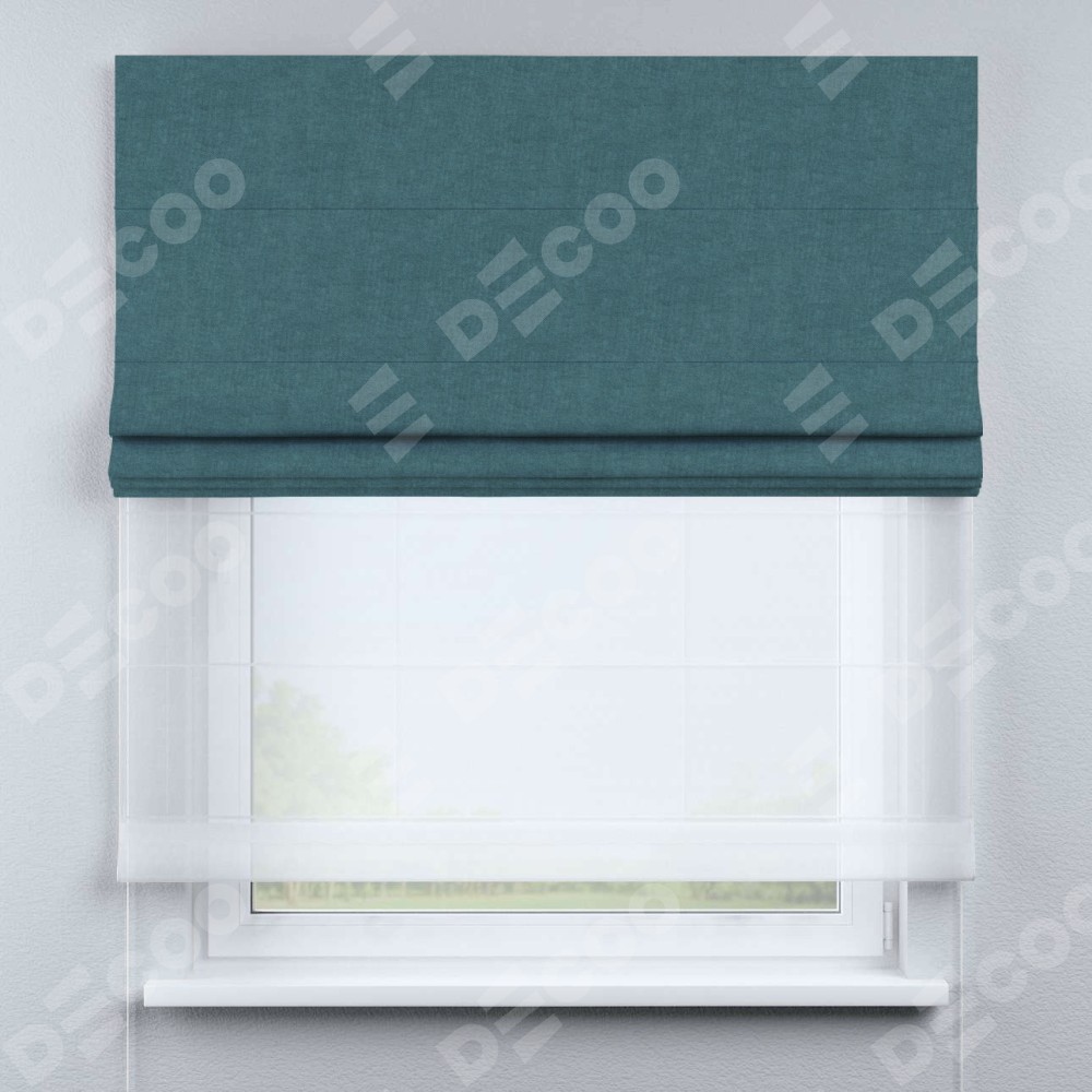 Римская штора день-ночь производителя «Cortin», используется для проёма, пошита из двух полотен, с лицевой стороны канвас ментоловый артикул v-114, вторая ткань тюль (по стандарту комплектуется тюль белого цвета артикул V-01). Имеет универсальный механизм и подходит для монтажа: на потолок, на стену и в нишу.