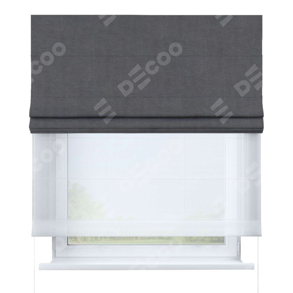 Римская штора день-ночь производителя «Cortin», используется для проёма, пошита из двух полотен, с лицевой стороны канвас мокрый асфальт артикул v-1083, вторая ткань тюль (по стандарту комплектуется тюль белого цвета артикул V-01). Имеет универсальный механизм и подходит для монтажа: на потолок, на стену и в нишу.