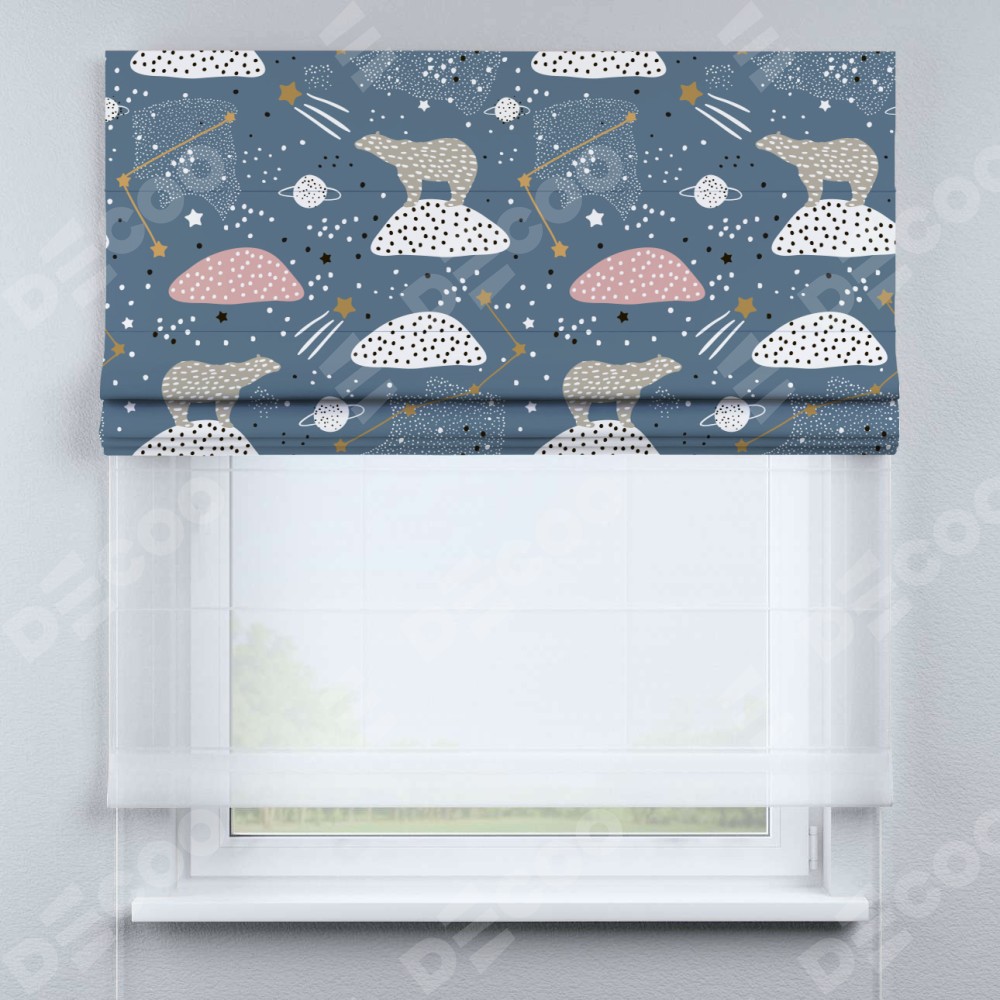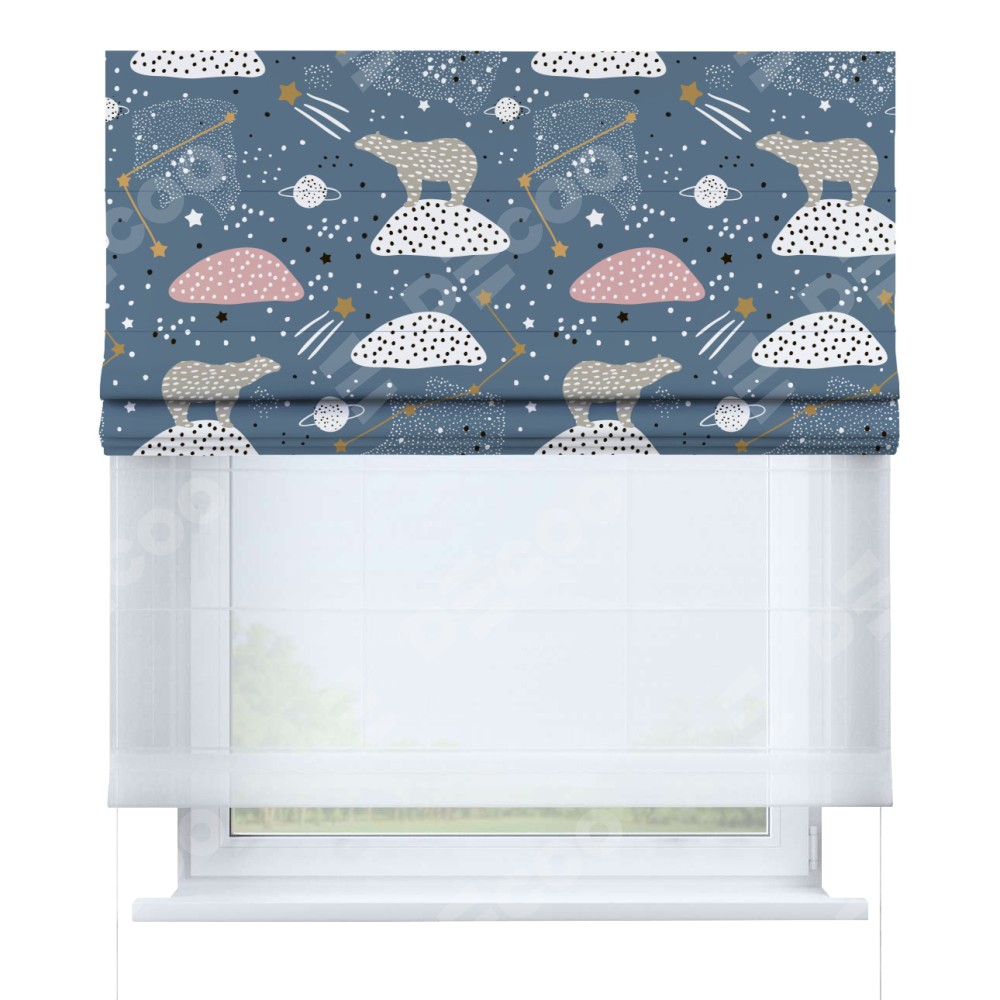 Римская штора день-ночь производителя «Cortin», используется для проёма, пошита из двух полотен, с лицевой блэкаут с нанесением сублимационной печати «Белые медведи», вторая ткань тюль (по стандарту комплектуется тюль белого цвета артикул V-01). Имеет универсальный механизм и подходит для монтажа: на потолок, на стену и в нишу.