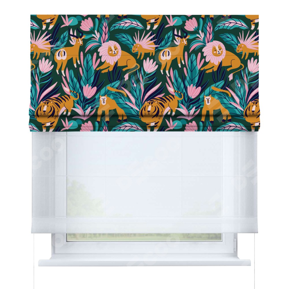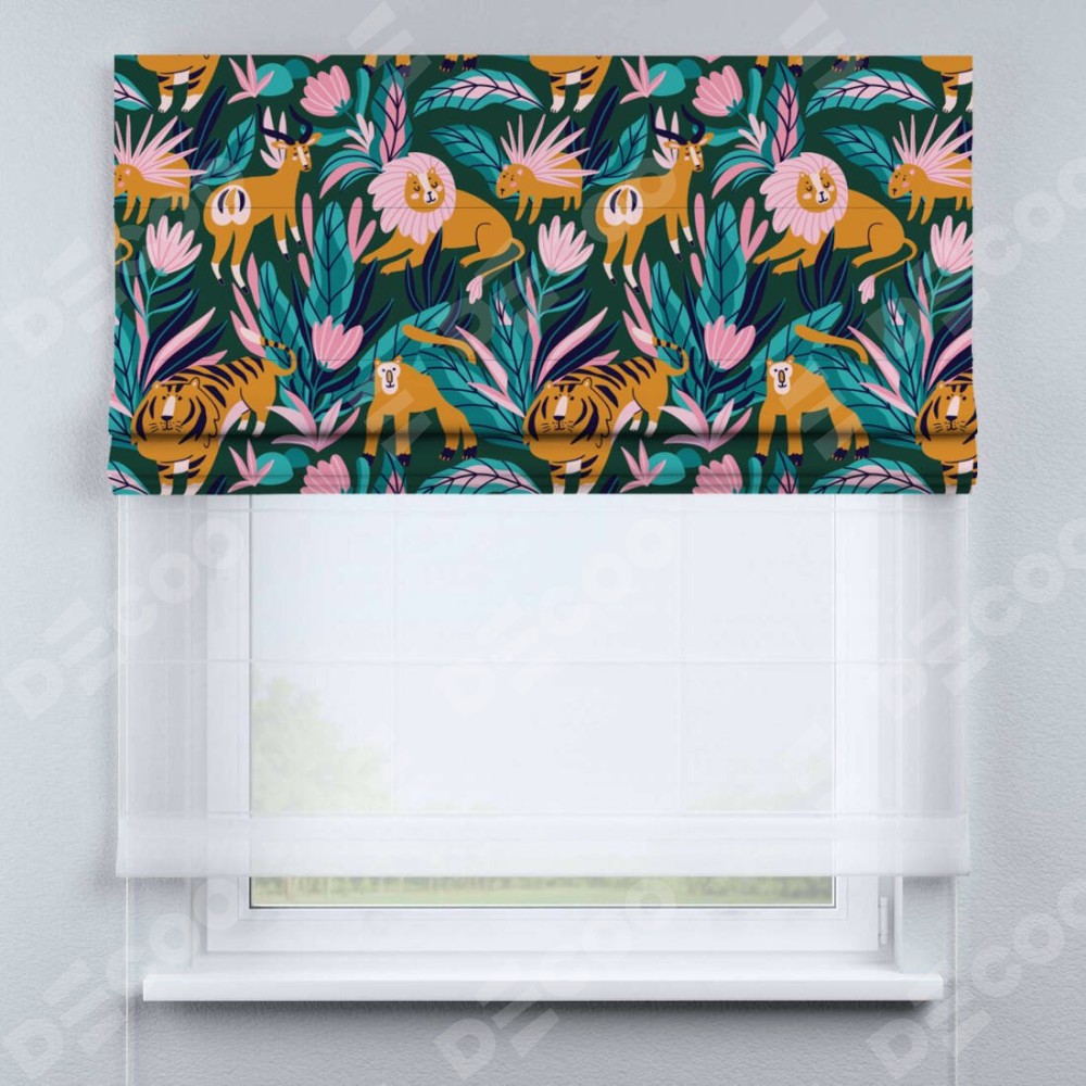 Римская штора день-ночь производителя «Cortin», используется для проёма, пошита из двух полотен, с лицевой блэкаут с нанесением сублимационной печати «Дикие животные», вторая ткань тюль (по стандарту комплектуется тюль белого цвета артикул V-01). Имеет универсальный механизм и подходит для монтажа: на потолок, на стену и в нишу.