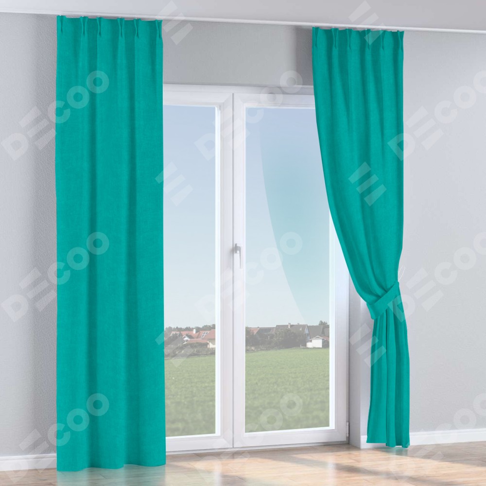 Комплект прямых штор, от производителя «Cortin», пошиты из ткани канвас бирюзовый, артикул ткани v-1048. С изнаночной стороны в верхней части штор пристрачивается шторная лента с декоративными складками «Кустик». Для создания элегантных складок прямые шторы шьются по стандарту с коэффициентом 1:2 (на 100 см. ширины проёма 200 см. ширины ткани).