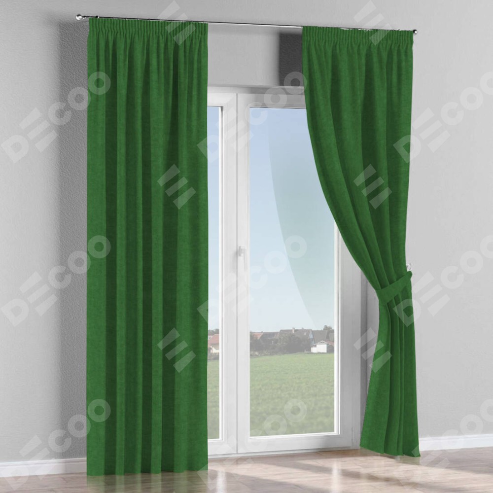 Комплект прямых штор, от производителя «Cortin», пошиты из ткани канвас зелёный, артикул ткани v-16. С изнаночной стороны в верхней части штор пристрачивается шторная лента с декоративными складками «Карандаш». Для создания элегантных складок прямые шторы шьются по стандарту с коэффициентом 1:2 (на 100 см. ширины проёма 200 см. ширины ткани).