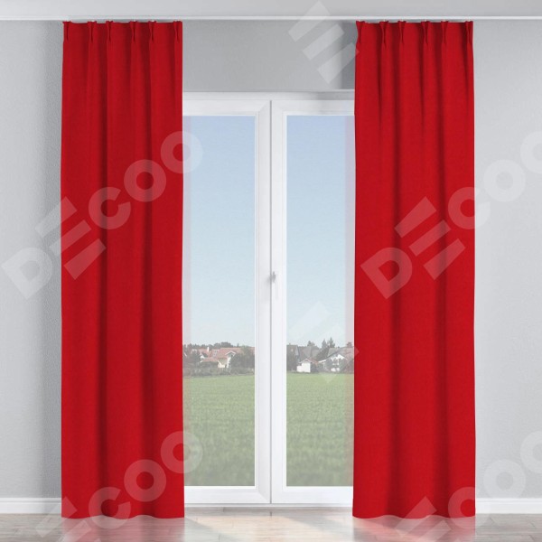 Комплект прямых штор, от производителя «Cortin», пошиты из ткани канвас красный, артикул ткани v-113. С изнаночной стороны в верхней части штор пристрачивается шторная лента с декоративными складками «Кустик». Для создания элегантных складок прямые шторы шьются по стандарту с коэффициентом 1:2 (на 100 см. ширины проёма 200 см. ширины ткани).