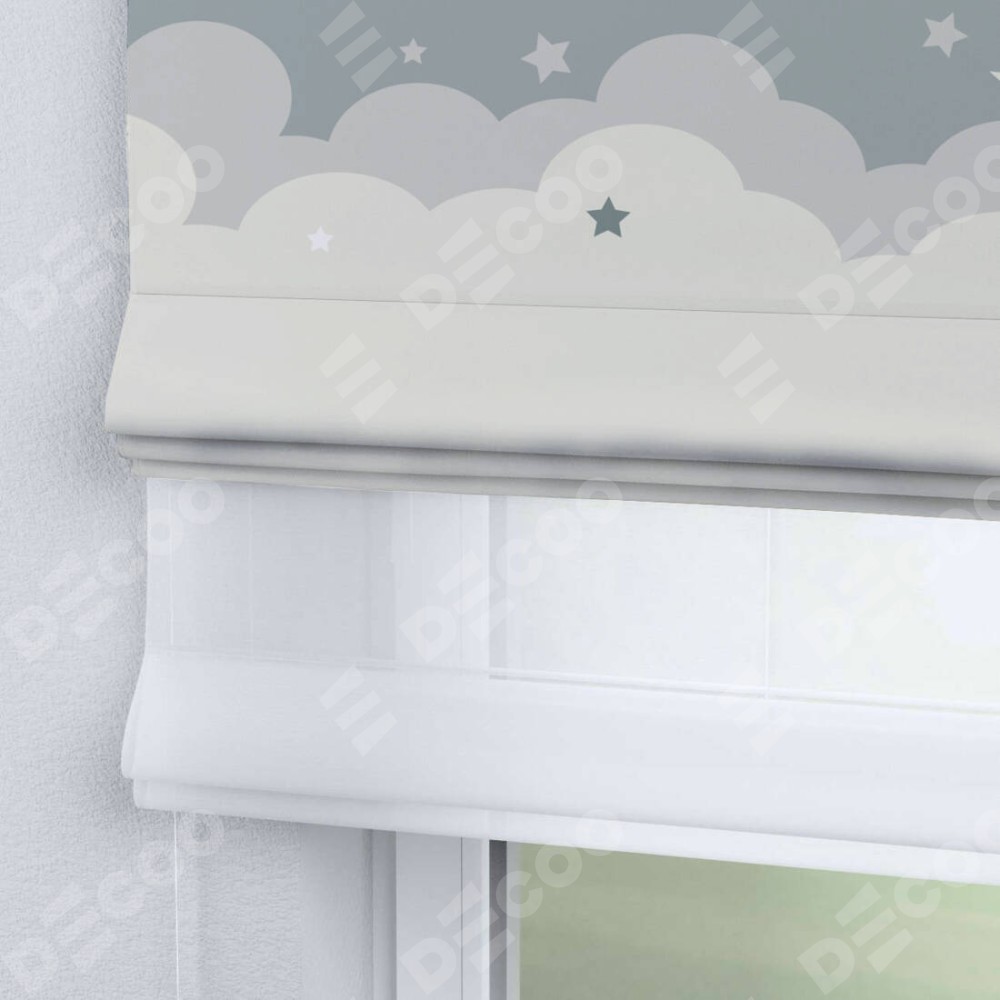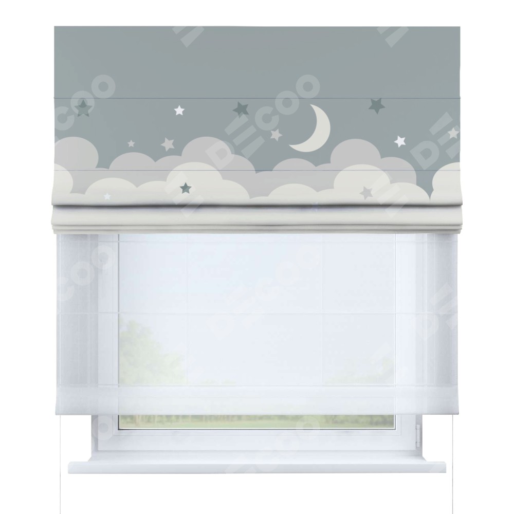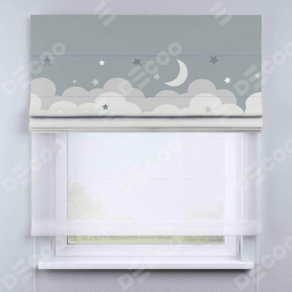 Римская штора день-ночь производителя «Cortin», используется для проёма, пошита из двух полотен, с лицевой блэкаут с нанесением сублимационной печати «Ночные облака», вторая ткань тюль (по стандарту комплектуется тюль белого цвета артикул V-01). Имеет универсальный механизм и подходит для монтажа: на потолок, на стену и в нишу.