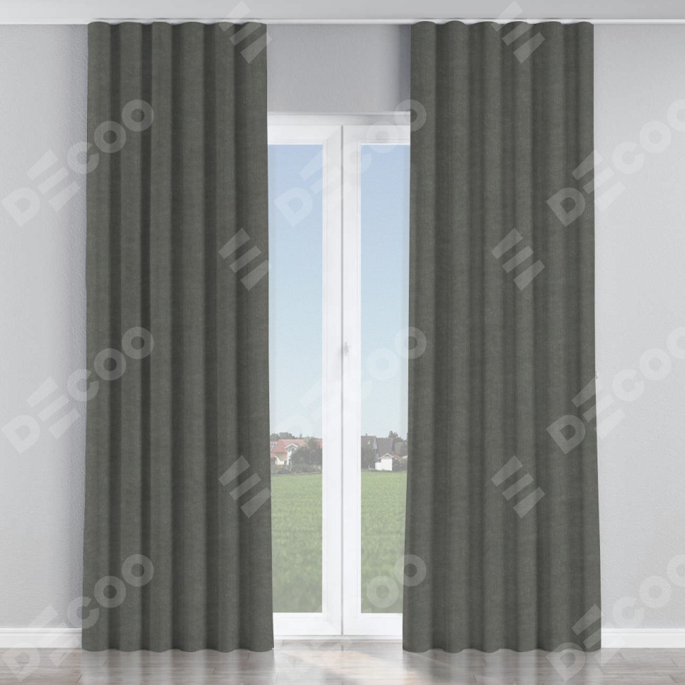 Комплект прямых штор, от производителя «Cortin», пошиты из ткани канвас тёмно-серый, артикул ткани v-340. С изнаночной стороны в верхней части штор пристрачивается шторная лента с декоративными складками «Волна». Для создания элегантных складок прямые шторы шьются по стандарту с коэффициентом 1:2 (на 100 см. ширины проёма 200 см. ширины ткани).