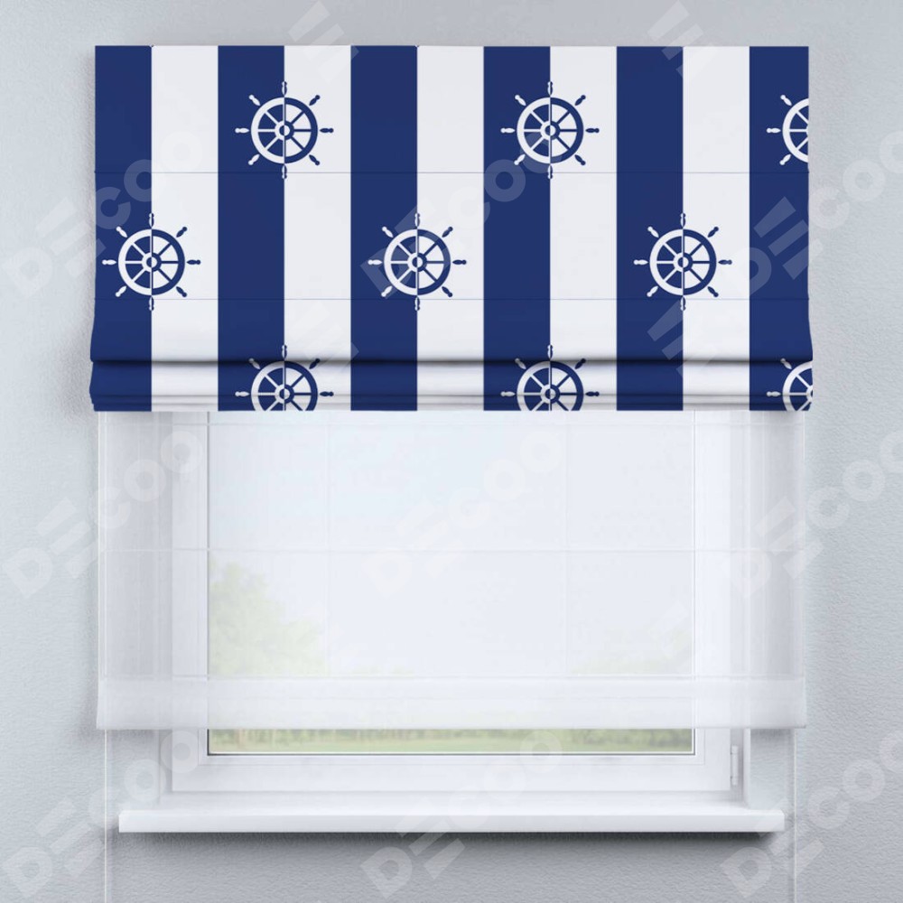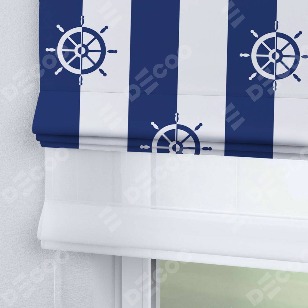 Римская штора день-ночь производителя «Cortin», используется для проёма, пошита из двух полотен, с лицевой блэкаут с нанесением сублимационной печати «Полоски и штурвалы», вторая ткань тюль (по стандарту комплектуется тюль белого цвета артикул V-01). Имеет универсальный механизм и подходит для монтажа: на потолок, на стену и в нишу.