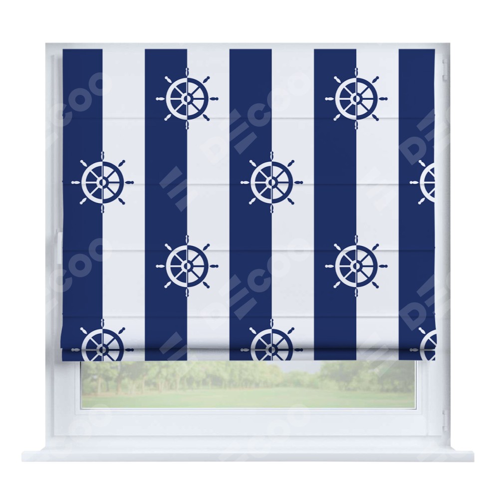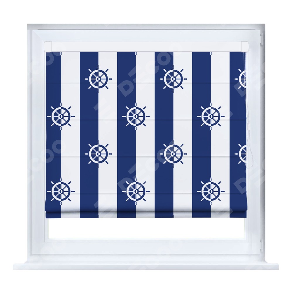 Римская штора производителя «Cortin», устанавливается на створку окна, пошита из ткани блэкаут с нанесением сублимационной печати «Полоски и штурвалы». Штора шьётся по индивидуальным размерам, для данного типа римской шторы возможная ширина от 35 до 150 см., высота до 250 см.