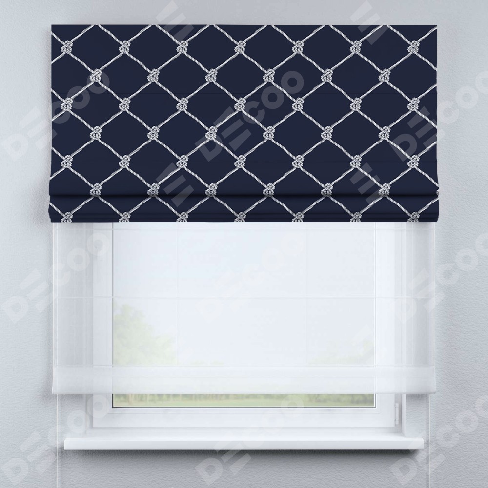 Римская штора день-ночь производителя «Cortin», используется для проёма, пошита из двух полотен, с лицевой блэкаут с нанесением сублимационной печати «Морские веревки», вторая ткань тюль (по стандарту комплектуется тюль белого цвета артикул V-01). Имеет универсальный механизм и подходит для монтажа: на потолок, на стену и в нишу.