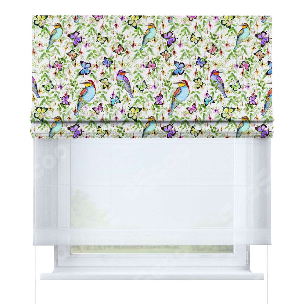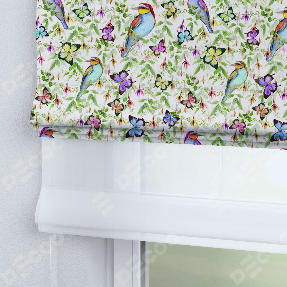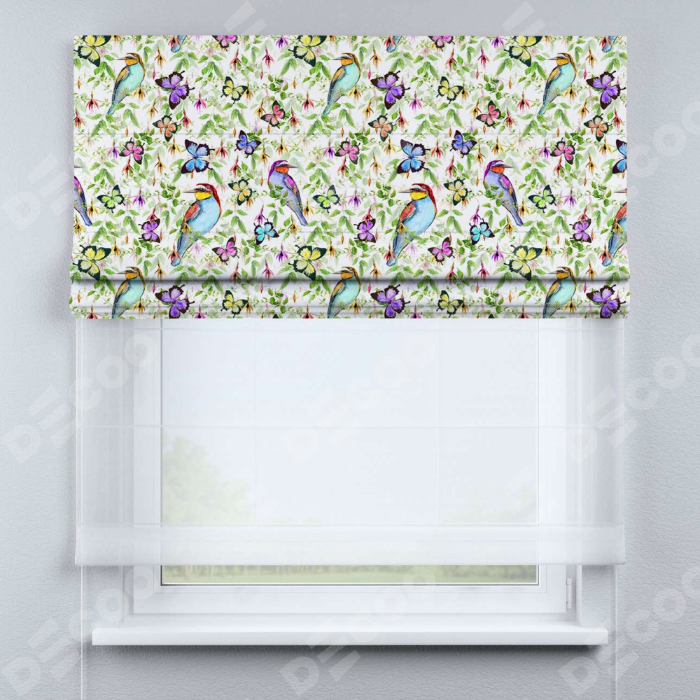 Римская штора день-ночь производителя «Cortin», используется для проёма, пошита из двух полотен, с лицевой блэкаут с нанесением сублимационной печати «Тропические птицы», вторая ткань тюль (по стандарту комплектуется тюль белого цвета артикул V-01). Имеет универсальный механизм и подходит для монтажа: на потолок, на стену и в нишу.