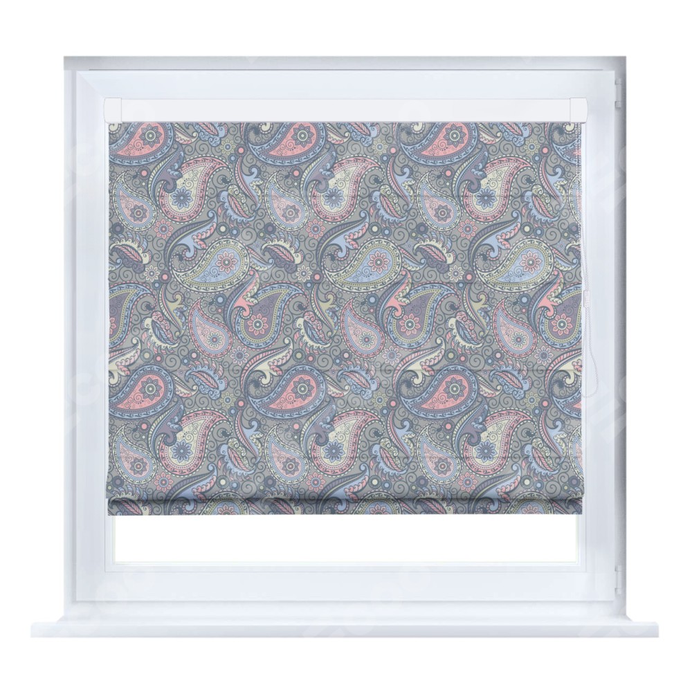 Римская штора производителя «Cortin», устанавливается на створку окна, пошита из ткани блэкаут с нанесением сублимационной печати «Цветной пейсли». Штора шьётся по индивидуальным размерам, для данного типа римской шторы возможная ширина от 35 до 150 см., высота до 250 см.