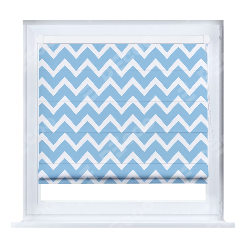 Римская штора кассетного типа, производителя «Cortin», устанавливается только на пластиковые окна и прилегает к стеклопакету, пошита из ткани блэкаут с нанесением сублимационной печати «Зигзаг средний».