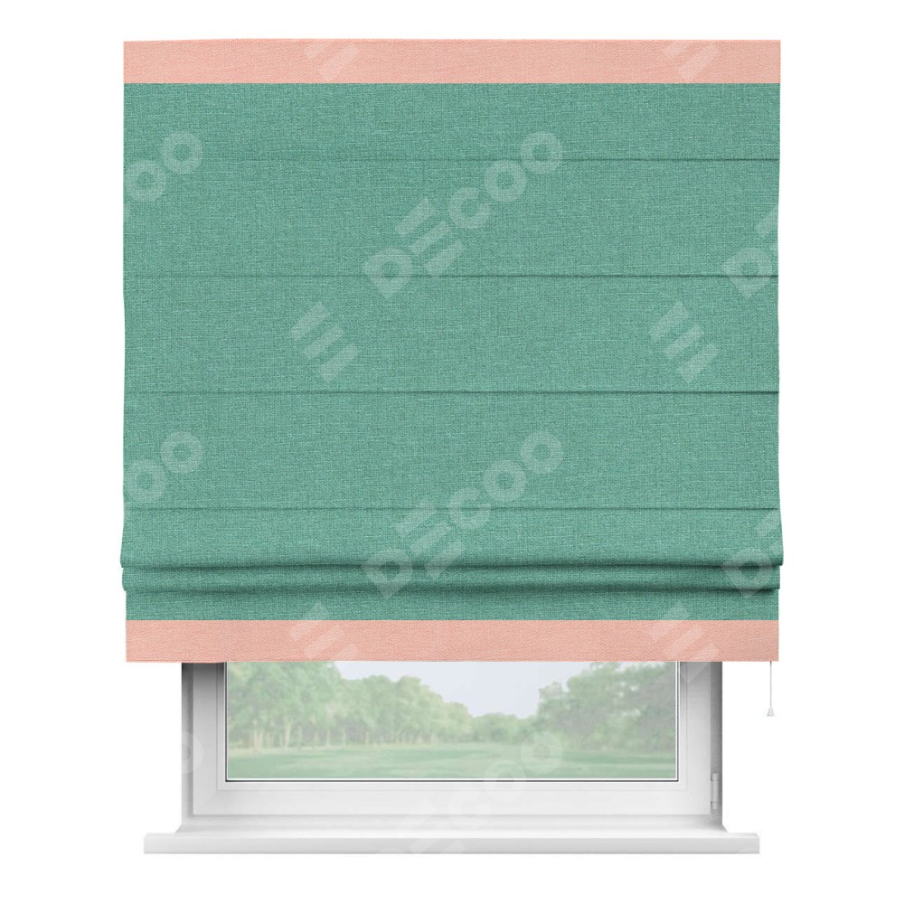 Римская штора производителя «Cortin», используется для проёма, пошита из ткани лён светло-бирюзовый, артикул 53435. Отделка шторы кантом «Горизонт», ткань для канта используется из льна разной расцветки на выбор. Имеет универсальный механизм и подходит для монтажа: на потолок, на стену и в нишу.