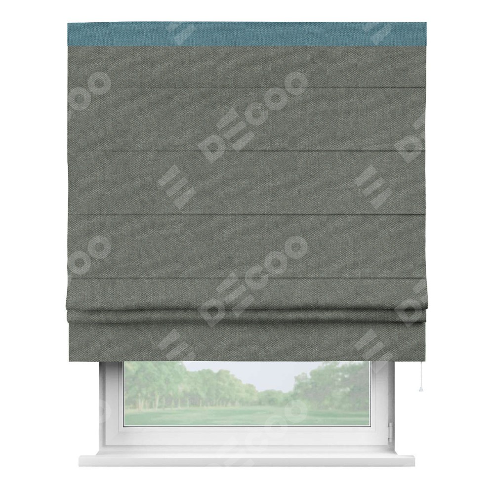 Римская штора производителя «Cortin», используется для проёма, пошита из ткани лён димаут тёмно-серый, артикул 91011. Отделка шторы кантом «Кинг», ткань для канта используется из льна димаут разной расцветки на выбор. Имеет универсальный механизм и подходит для монтажа: на потолок, на стену и в нишу.