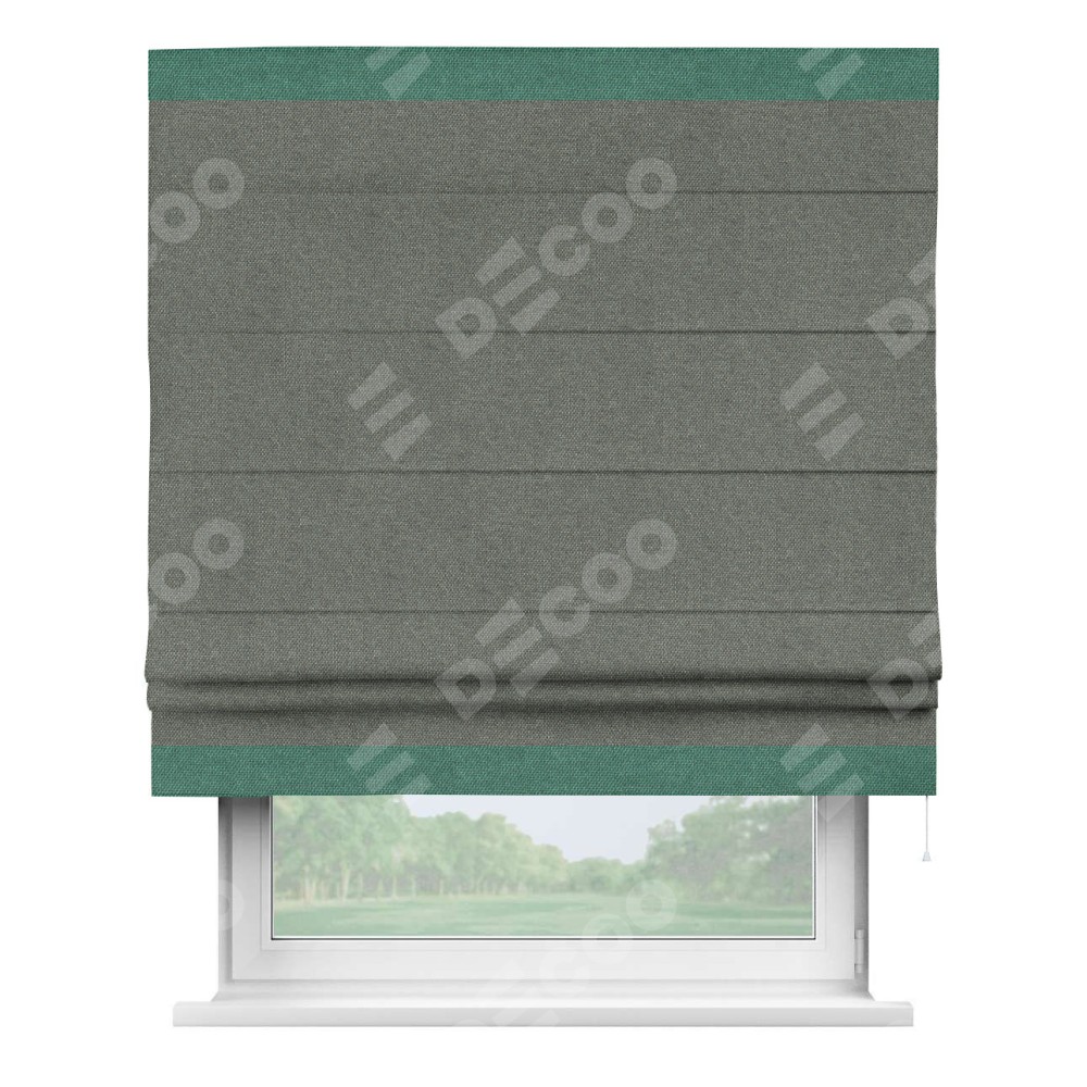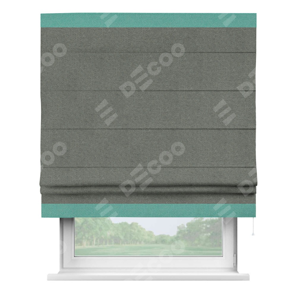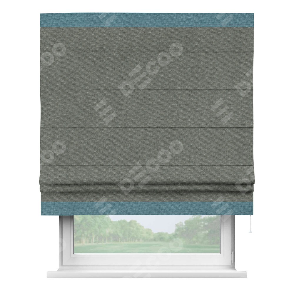 Римская штора производителя «Cortin», используется для проёма, пошита из ткани лён димаут тёмно-серый, артикул 91011. Отделка шторы кантом «Горизонт», ткань для канта используется из льна димаут разной расцветки на выбор. Имеет универсальный механизм и подходит для монтажа: на потолок, на стену и в нишу.