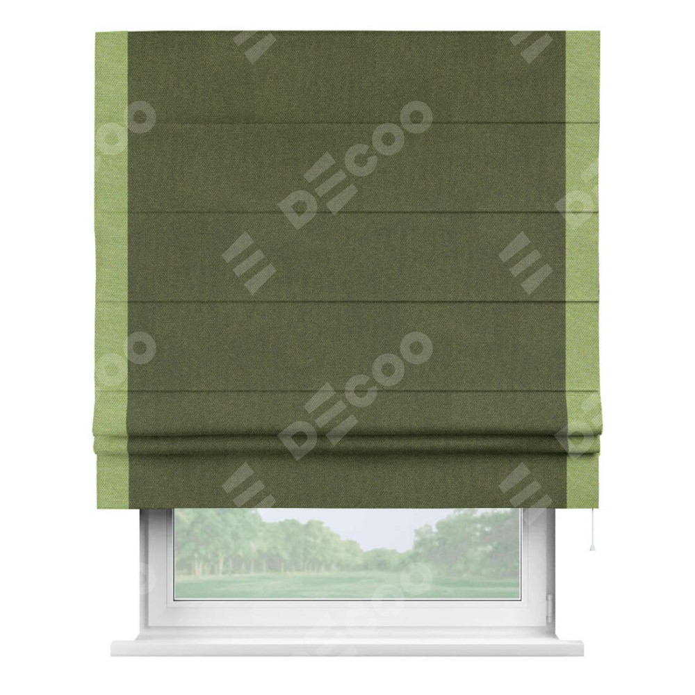Римская штора производителя «Cortin», используется для проёма, пошита из ткани лён димаут салатовый, артикул 91002. Отделка шторы кантом «Стрим Дуо», ткань для канта используется из льна димаут разной расцветки на выбор. Имеет универсальный механизм и подходит для монтажа: на потолок, на стену и в нишу.