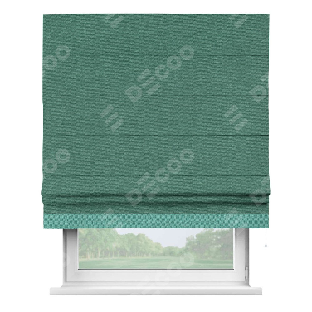 Римская штора производителя «Cortin», используется для проёма, пошита из ткани лён димаут светло-бирюзовый, артикул 91005. Отделка шторы кантом «Джестер», ткань для канта используется из льна димаут разной расцветки на выбор. Имеет универсальный механизм и подходит для монтажа: на потолок, на стену и в нишу.