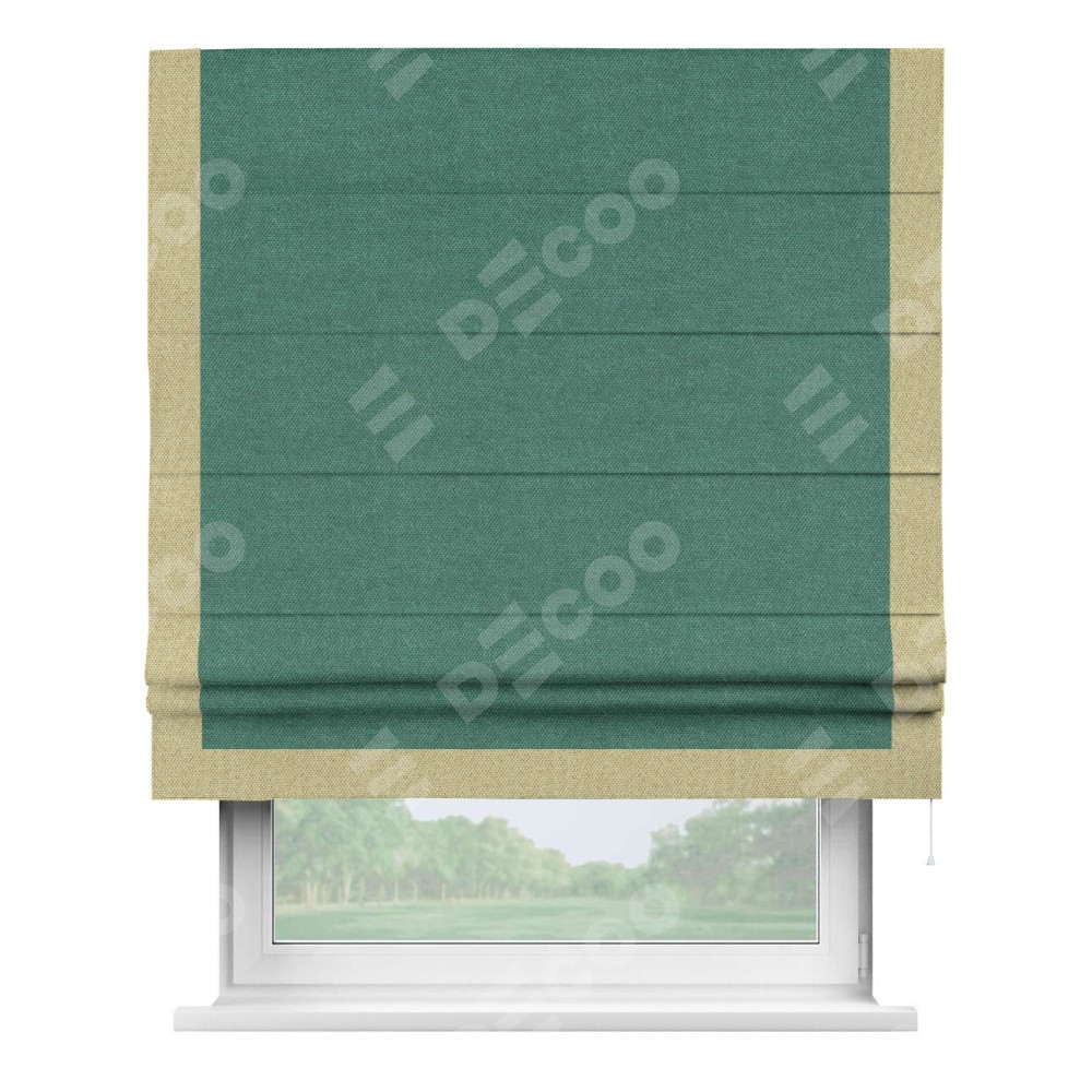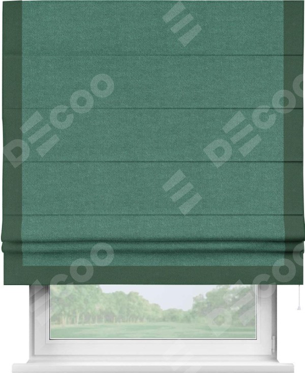Римская штора производителя «Cortin», используется для проёма, пошита из ткани лён димаут светло-бирюзовый, артикул 91005. Отделка шторы кантом «Виктория», ткань для канта используется из льна димаут разной расцветки на выбор. Имеет универсальный механизм и подходит для монтажа: на потолок, на стену и в нишу.