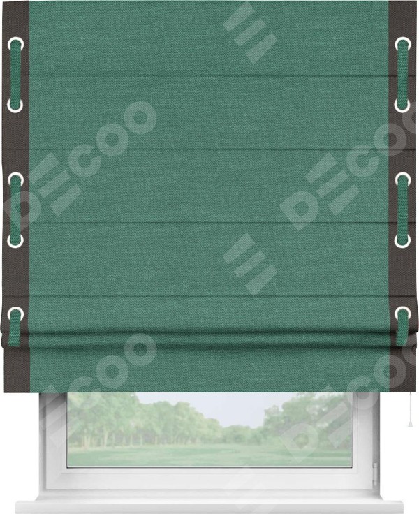 Римская штора «Кортин» для проема, лён димаут светло-бирюзовый с кантом Стрим Дуо (люверсы с пояском)
