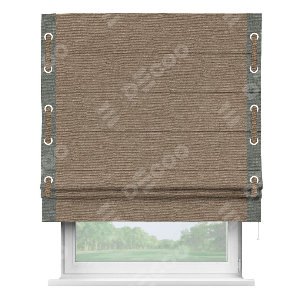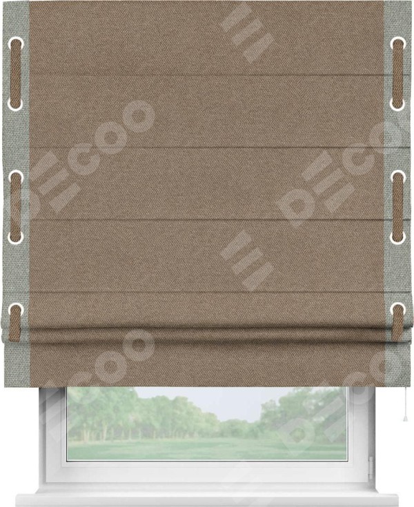 Римская штора «Кортин» для проема, лён димаут коричневый с кантом Стрим Дуо (люверсы с пояском)