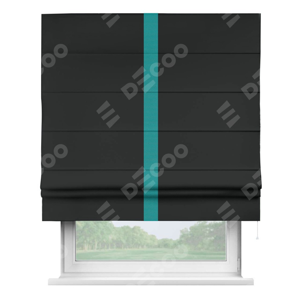 Римская штора производителя «Cortin», используется для проёма, пошита из ткани блэкаут однотонный черный, артикул ткани 91571−2. Отделка шторы кантом «Хайвей», ткань для канта используется из блэкаута однотонного разной расцветки на выбор. Имеет универсальный механизм и подходит для монтажа: на потолок, на стену и в нишу.