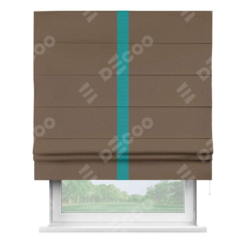 Римская штора производителя «Cortin», используется для проёма, пошита из ткани блэкаут однотонный коричневый, артикул ткани 91334. Отделка шторы кантом «Хайвей», ткань для канта используется из блэкаута однотонного разной расцветки на выбор. Имеет универсальный механизм и подходит для монтажа: на потолок, на стену и в нишу.