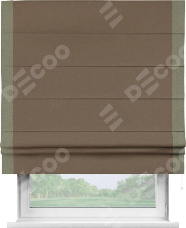 Римская штора производителя «Cortin», используется для проёма, пошита из ткани блэкаут однотонный коричневый, артикул ткани 91334. Отделка шторы кантом «Стрим Дуо», ткань для канта используется из блэкаута однотонного разной расцветки на выбор. Имеет универсальный механизм и подходит для монтажа: на потолок, на стену и в нишу.
