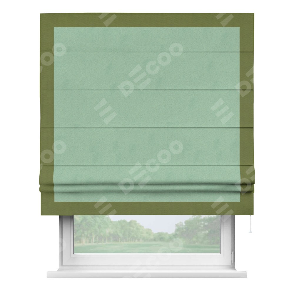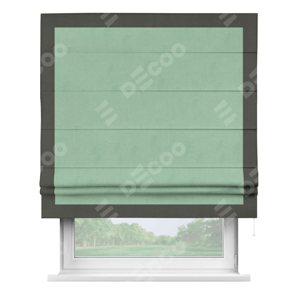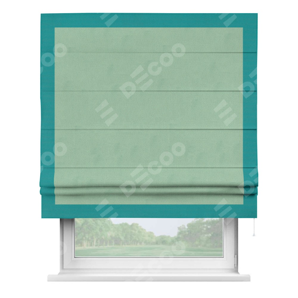 Римская штора производителя «Cortin», используется для проёма, пошита из ткани блэкаут однотонный ментоловый, артикул ткани 91572−1. Отделка шторы кантом «Чесс», ткань для канта используется из блэкаута однотонного разной расцветки на выбор. Имеет универсальный механизм и подходит для монтажа: на потолок, на стену и в нишу.