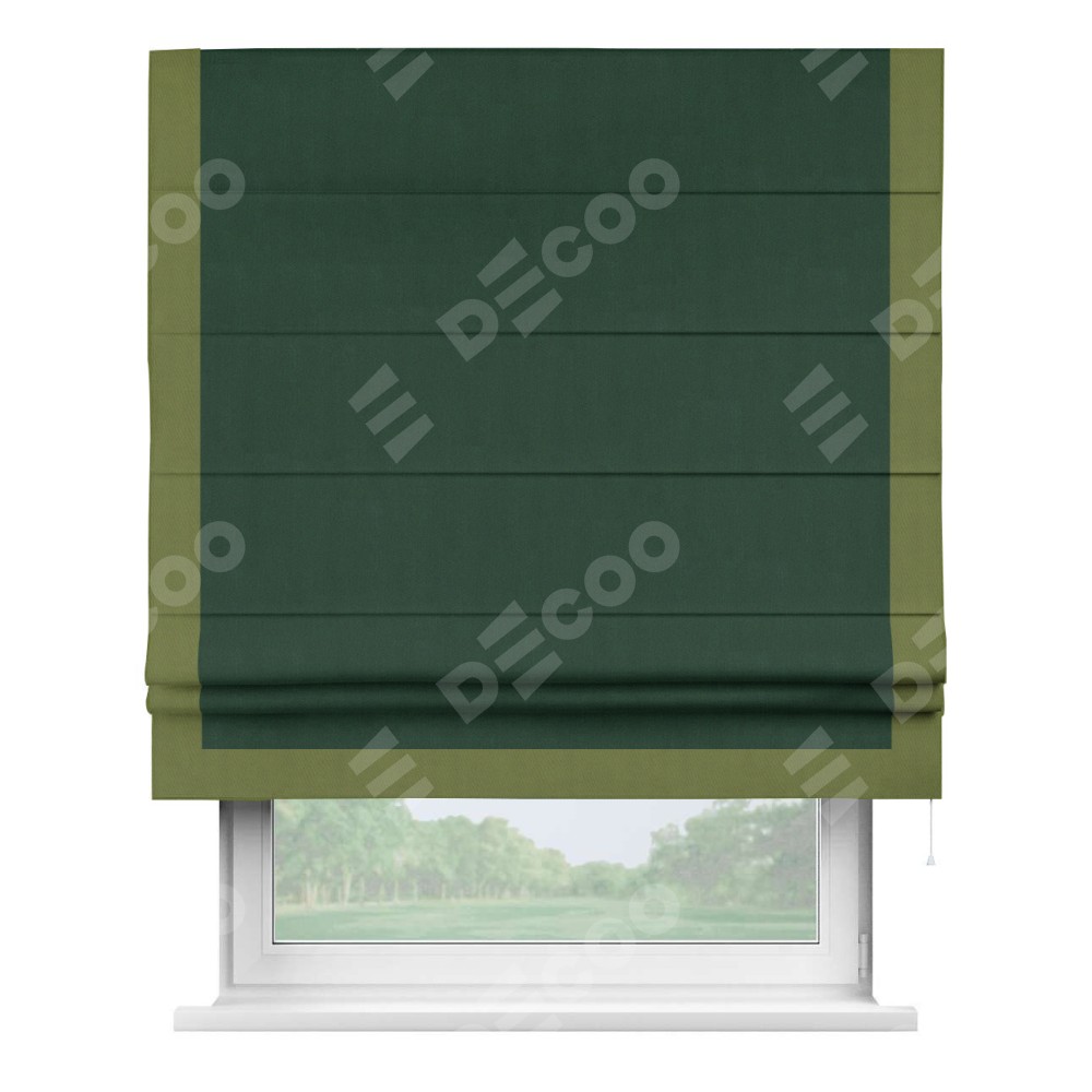 Римская штора производителя «Cortin», используется для проёма, пошита из ткани блэкаут однотонный зелёный, артикул ткани 91572−2. Отделка шторы кантом «Виктория», ткань для канта используется из блэкаута однотонного разной расцветки на выбор. Имеет универсальный механизм и подходит для монтажа: на потолок, на стену и в нишу.