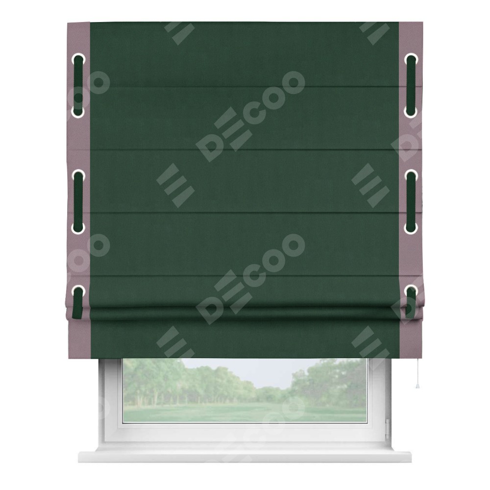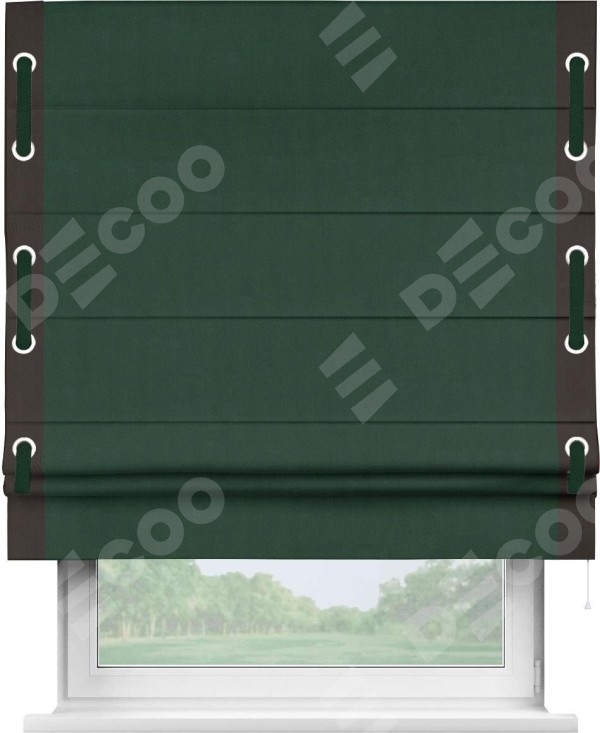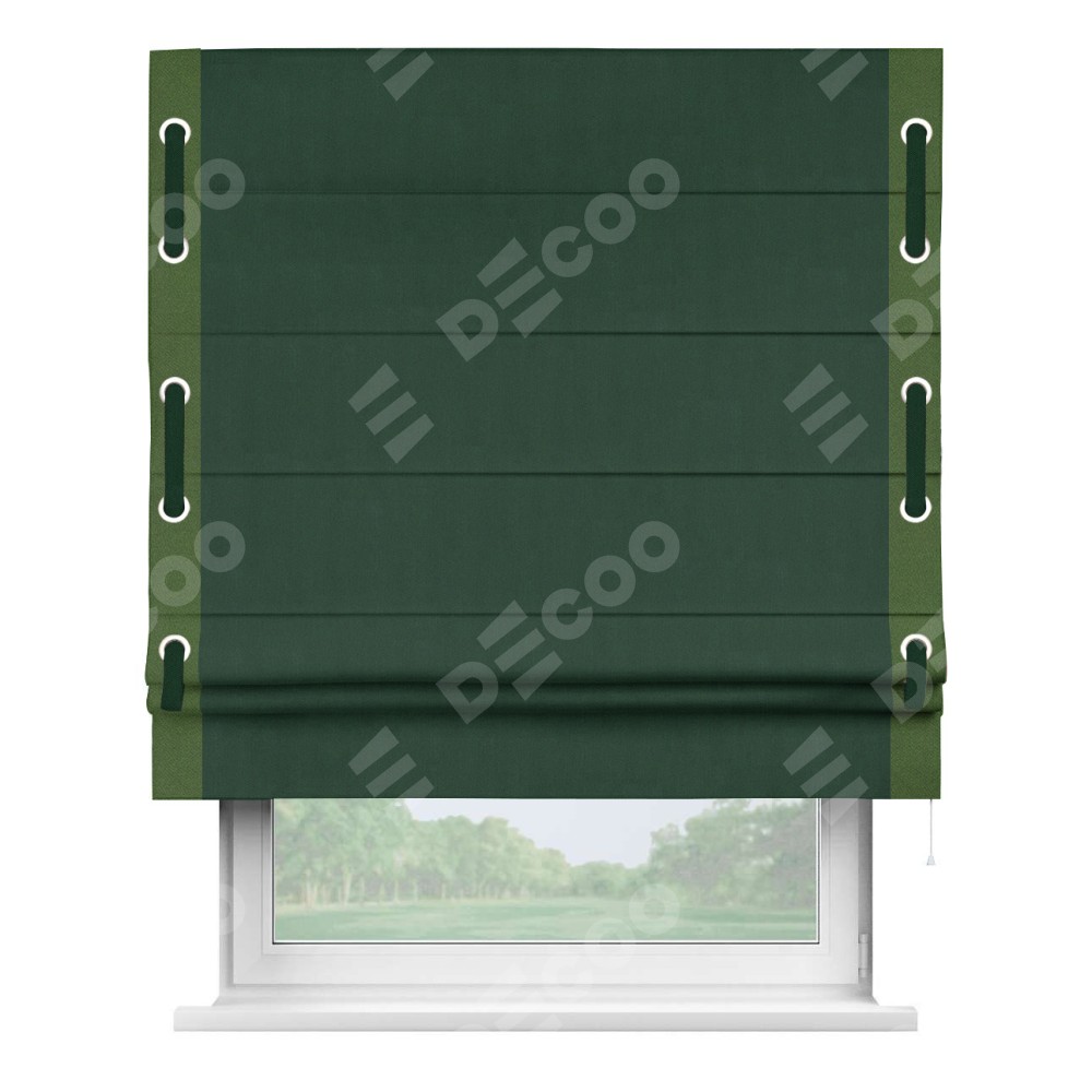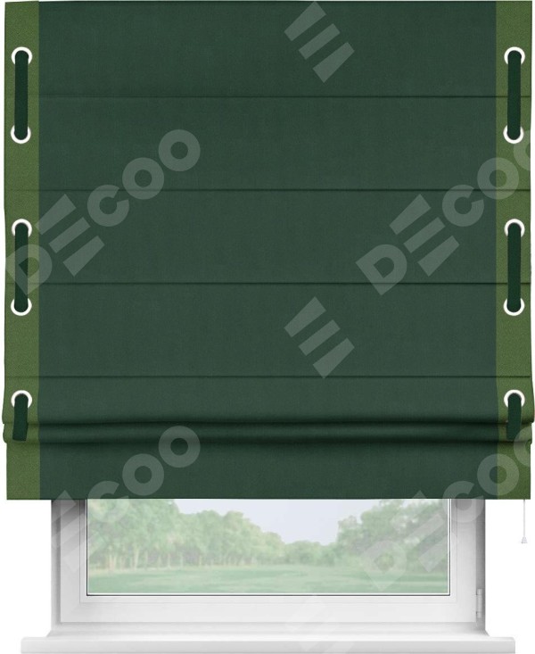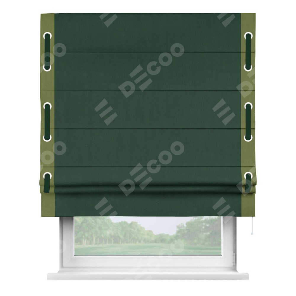 Римская штора «Кортин» для проема, блэкаут однотонный зелёный с кантом Стрим Дуо (люверсы с пояском)
