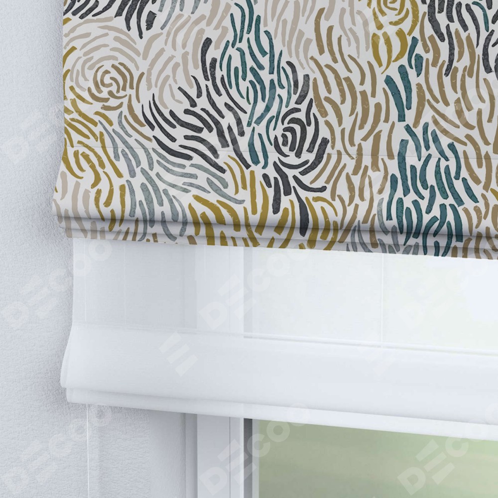 Двойная римская штора «День-ночь» от производителя Cortin предназначена для использования в проёмах. Эта штора уникальна тем, что состоит из двух полотен. На лицевой стороне находится блэкаут с нанесением сублимационной печати «Мистерия», обеспечивающий эффективное затемнение. В комплект также входит вторая ткань — легкий белый тюль (артикул: V-01), который добавляет изящества и легкости оформлению окна. Кроме того, доступны и другие разновидности ткани тюль, выбор которых доступен по  ссылке .