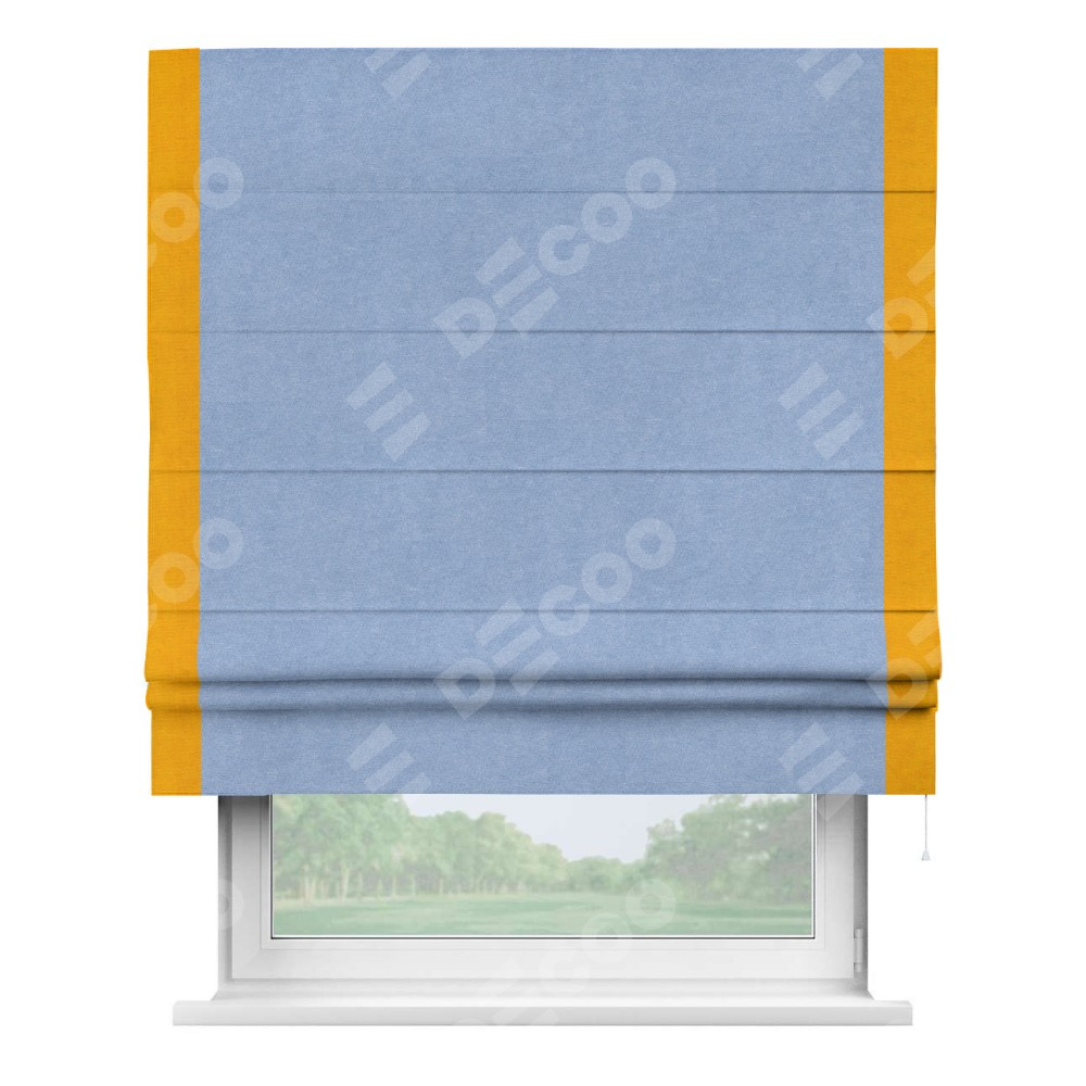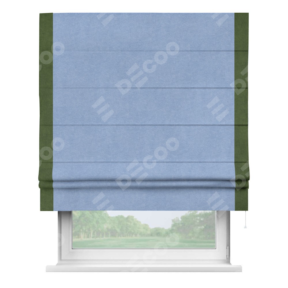 Римская штора производителя «Cortin», используется для проёма, пошита из ткани вельвет васильковый, артикул ткани 33799. Отделка шторы кантом «Стрим Дуо», ткань для канта используется из вельвета разной расцветки на выбор. Имеет универсальный механизм и подходит для монтажа: на потолок, на стену и в нишу.