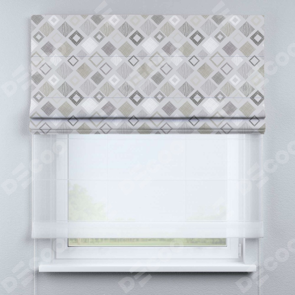 Двойная римская штора «День-ночь» от производителя Cortin предназначена для использования в проёмах. Эта штора уникальна тем, что состоит из двух полотен. На лицевой стороне находится блэкаут с нанесением сублимационной печати «Квадро», обеспечивающий эффективное затемнение. В комплект также входит вторая ткань — легкий белый тюль (артикул: V-01), который добавляет изящества и легкости оформлению окна. Кроме того, доступны и другие разновидности ткани тюль, выбор которых доступен по ссылке .