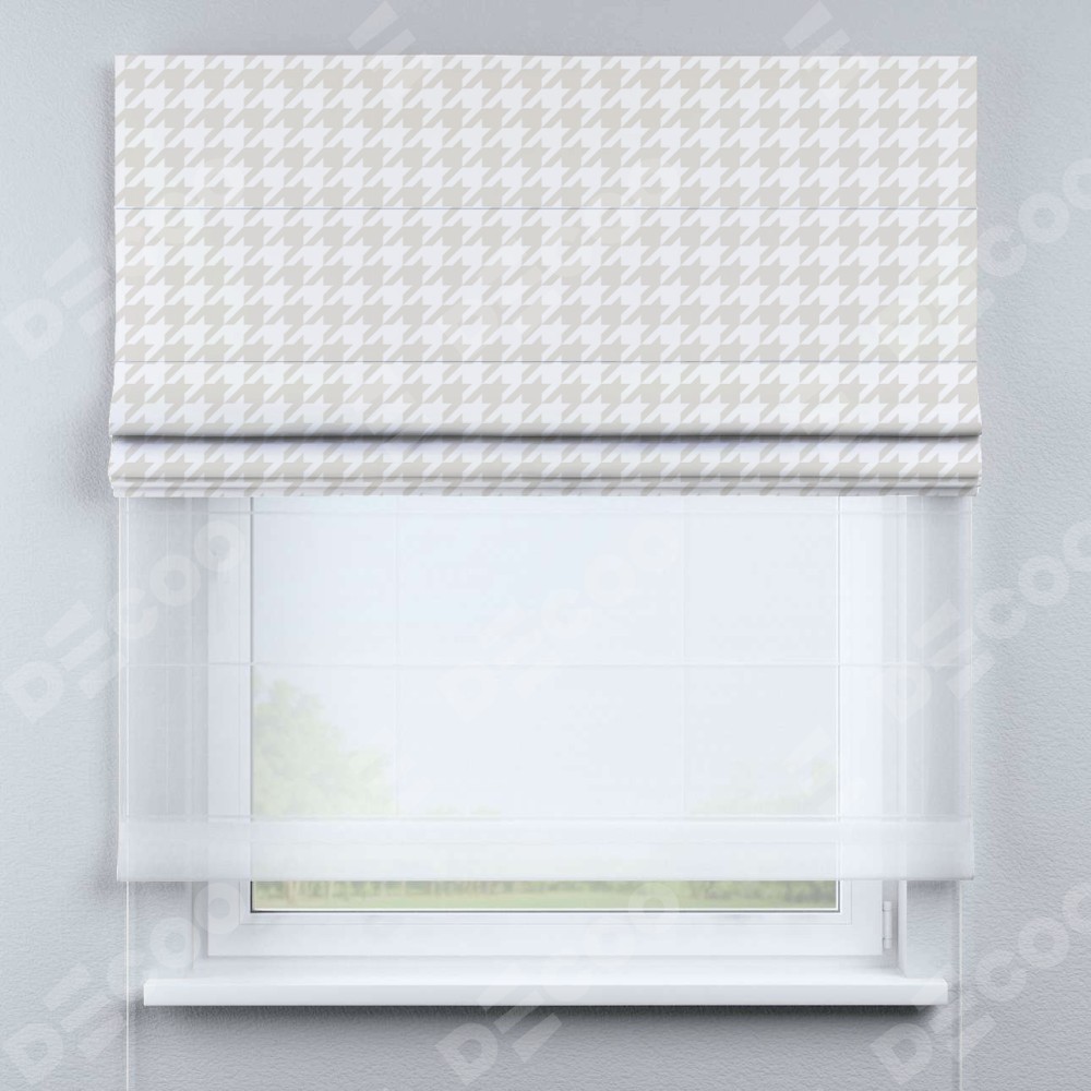 Двойная римская штора «День-ночь» от производителя Cortin предназначена для использования в проёмах. Эта штора уникальна тем, что состоит из двух полотен. На лицевой стороне находится блэкаут с нанесением сублимационной печати «Гусиные лапки» молочный», обеспечивающий эффективное затемнение. В комплект также входит вторая ткань — легкий белый тюль (артикул: V-01), который добавляет изящества и легкости оформлению окна. Кроме того, доступны и другие разновидности ткани тюль, выбор которых доступен по  ссылке .