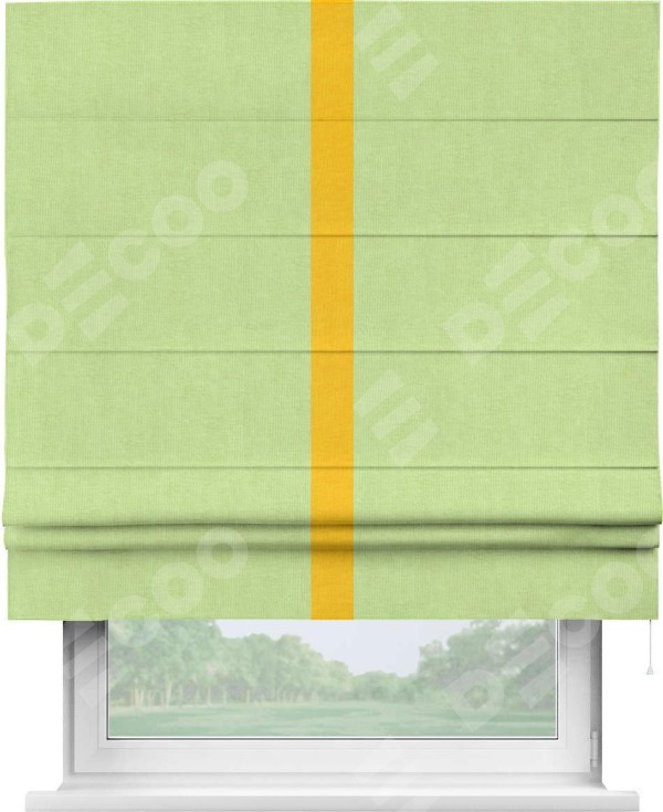 Римская штора производителя «Cortin», используется для проёма, пошита из ткани канвас липовый, артикул ткани v-207. Отделка шторы кантом «Хайвей» (желтый v-344), ткань для канта используется из канваса разной расцветки на выбор. Имеет универсальный механизм и подходит для монтажа: на потолок, на стену и в нишу.